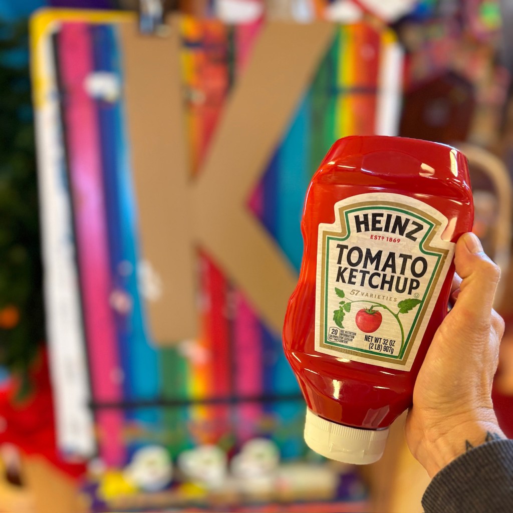 Kenny the K: Kenny is getting covered in ketchup (it’s actually paint in a ketchup bottle which makes for a fun joke so that’s where Joey the Jokey J is hanging out) this week and we pretend that they love anything red (because they think it’s ketchup!). Oh silly Kenny.