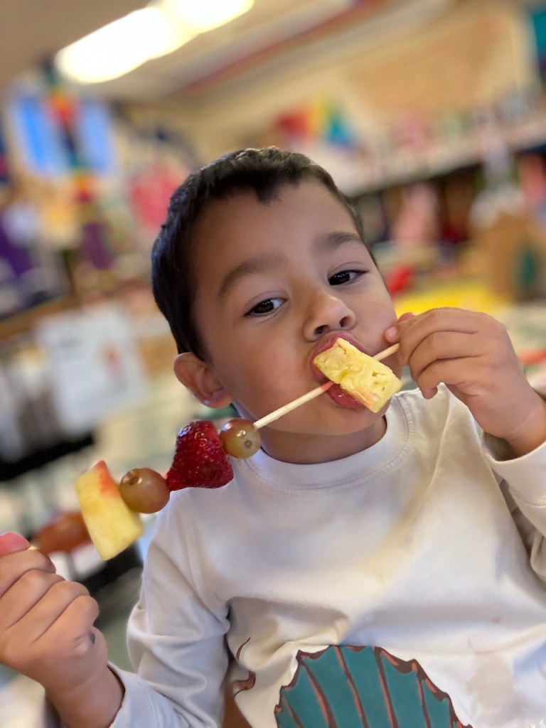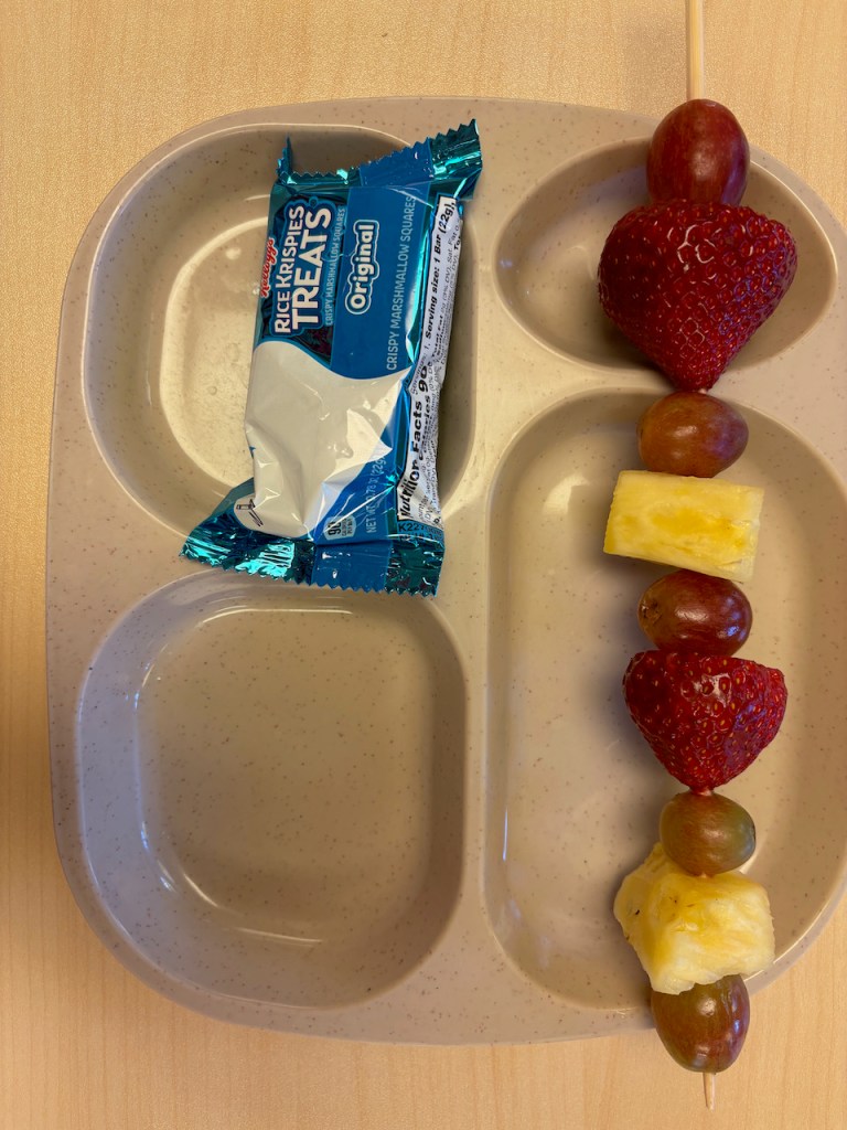 What did you eat for snack today? In the morning we fruit kabobs and rice Krispie treats from Heath. In the afternoon we had applesauce, honey cheerios and strawberry cookies. Thank you, friends!