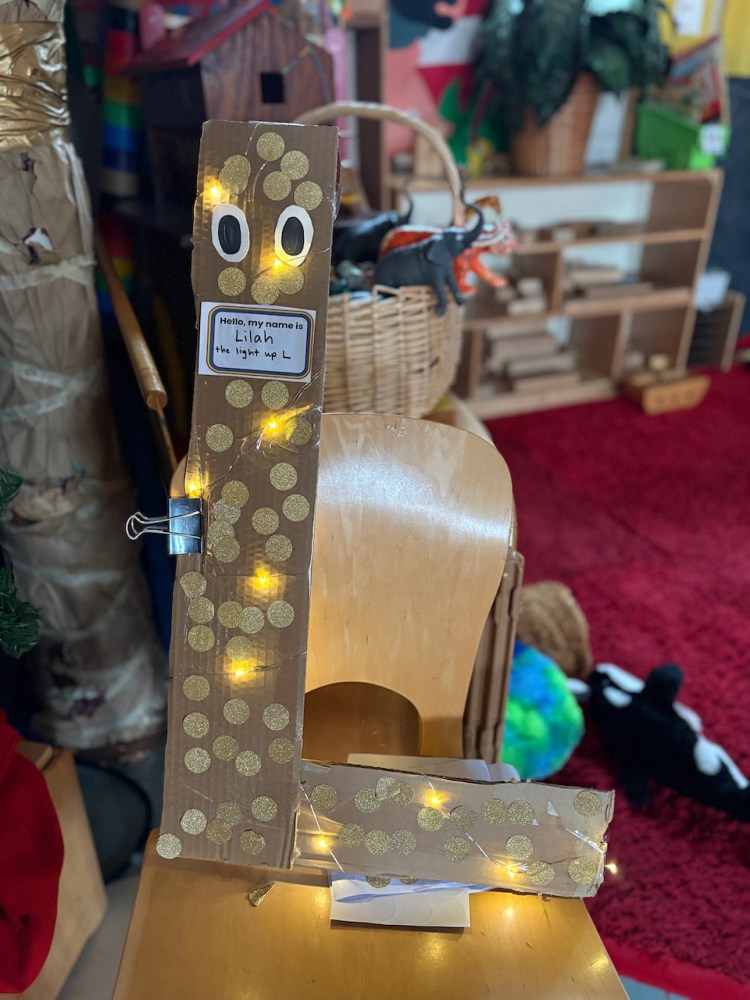 Lilah the L: Lilah is our Alphabet Friend who is covered in shiny things and real lights. She’s going to like being around anything that lights up!