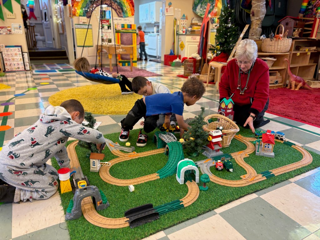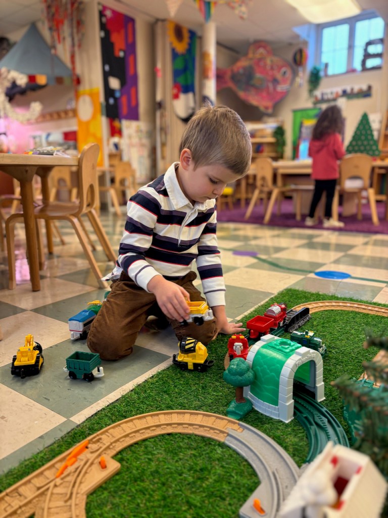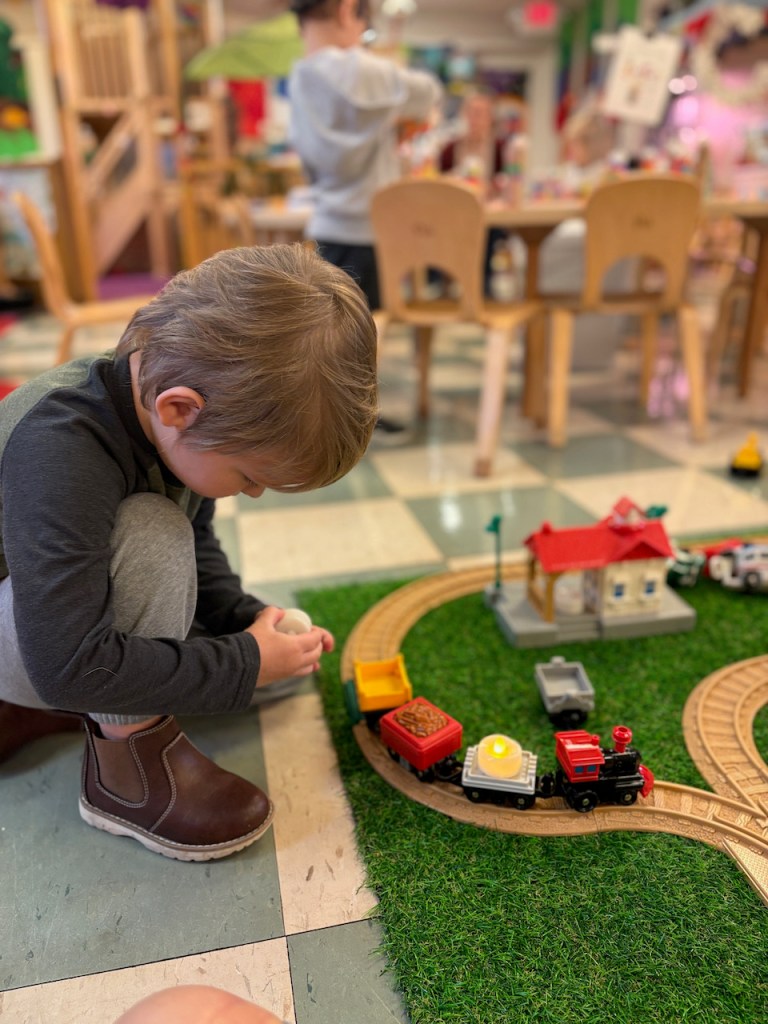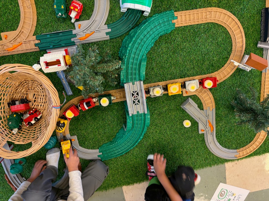 Locomotives: We have trains and tracks on our lawn (fake grass) rug along with battery tea lights. There has been so much magical play.