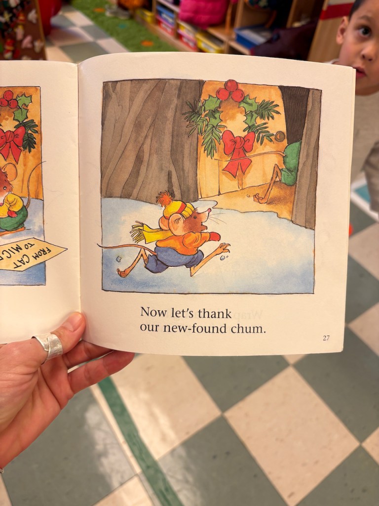 What does “chum” mean? Friend! It was a word in our book today: Christmas Mice. They made friends with the cat and called her their new found chum. So we called each other that too.