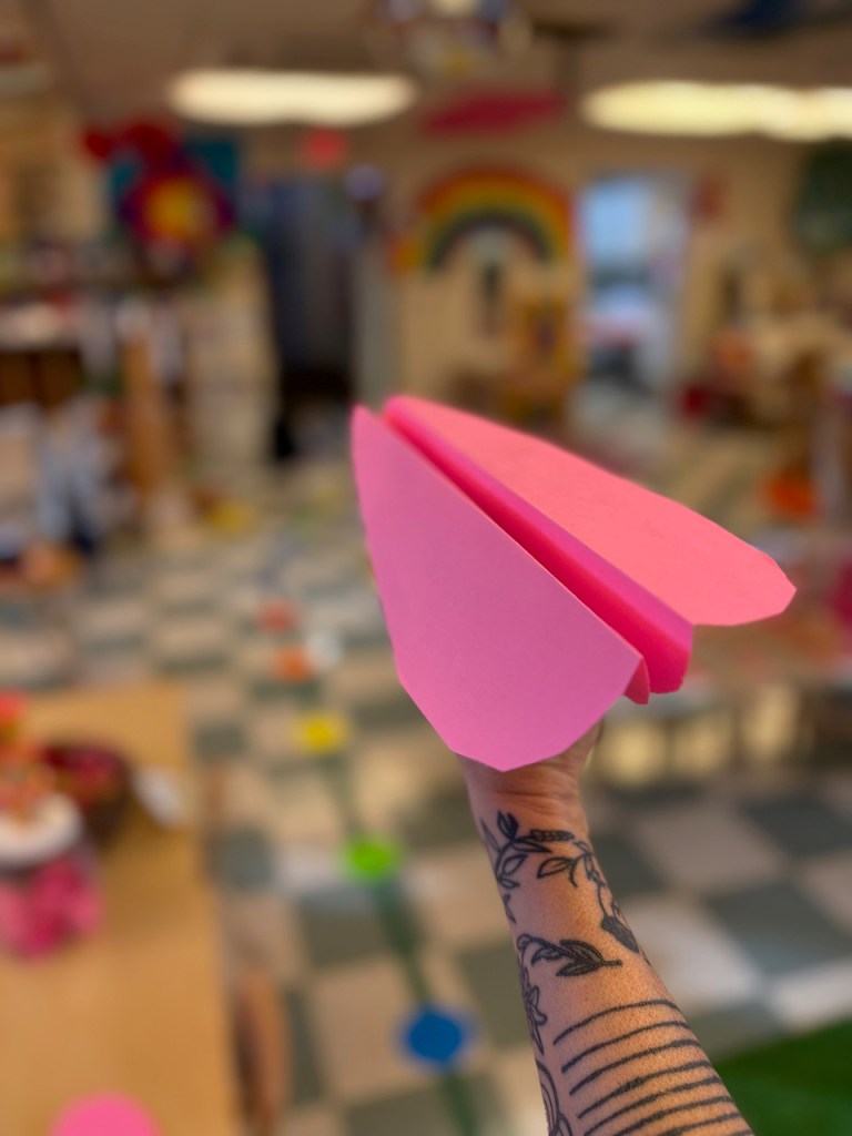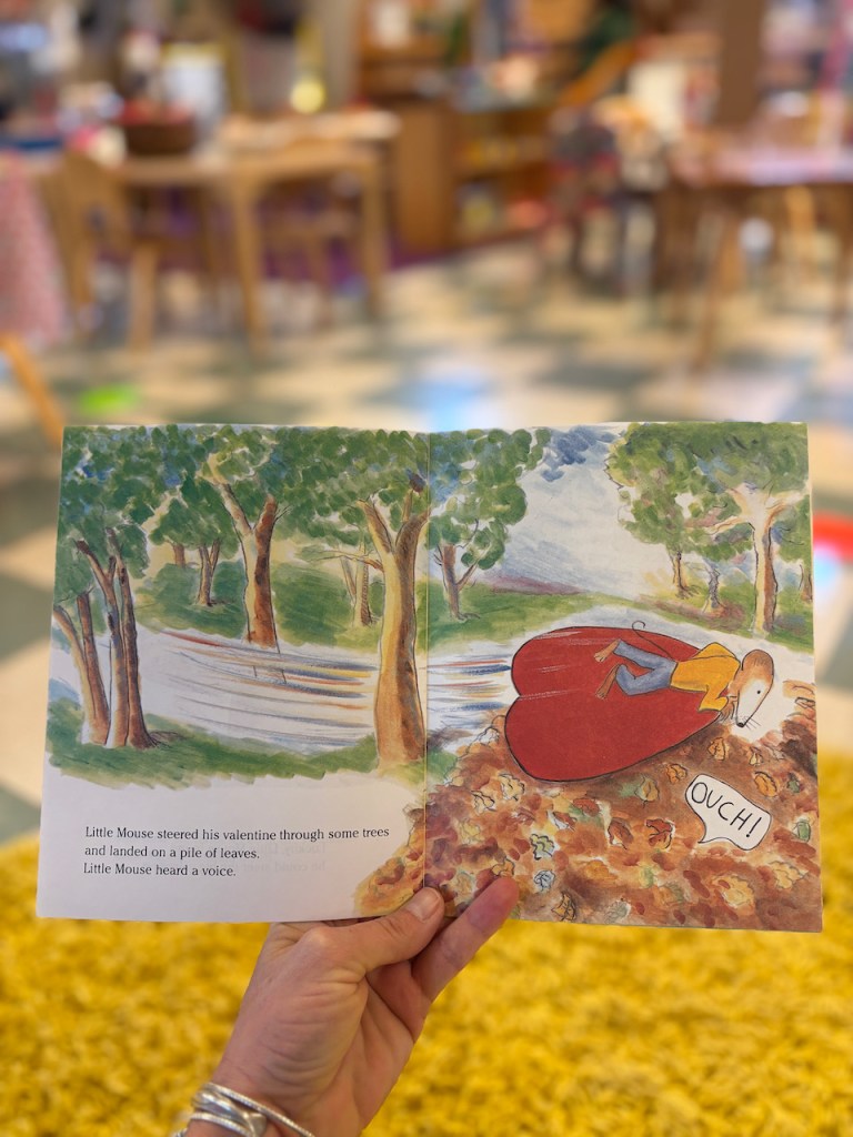In our book, Little Mouse’s Big Valentine, Little Mouse made a huge paper heart valentine and ended up riding it like an airplane before landing in a huge leaf pile (where he met a friend)…the most exciting part of the book.