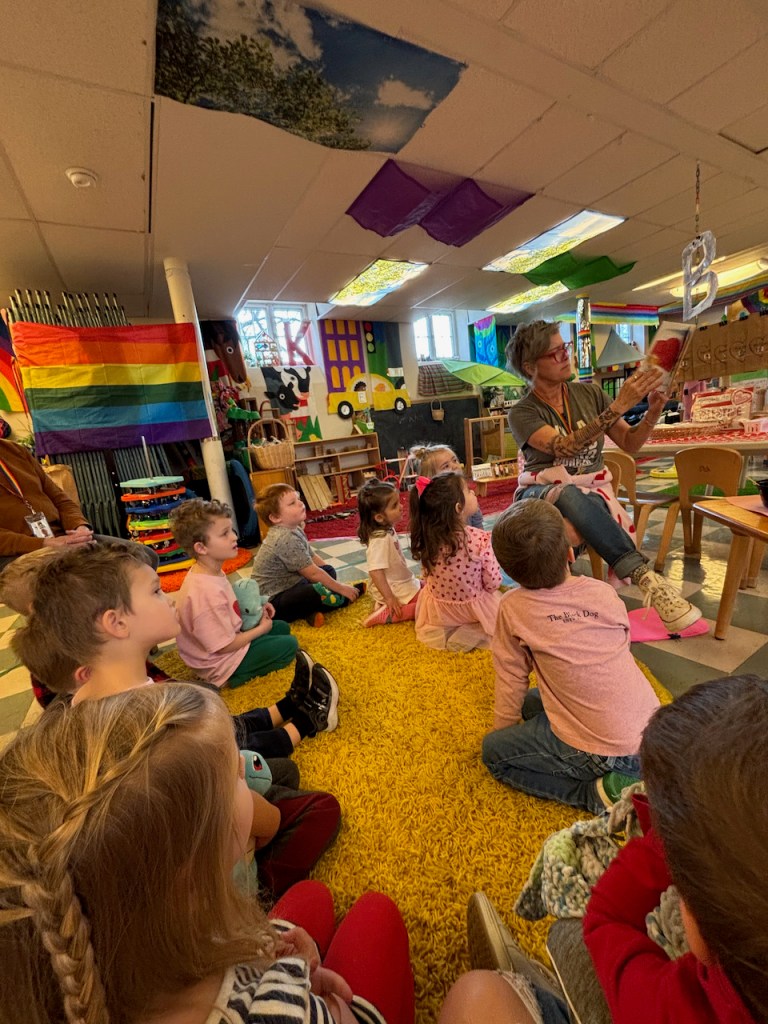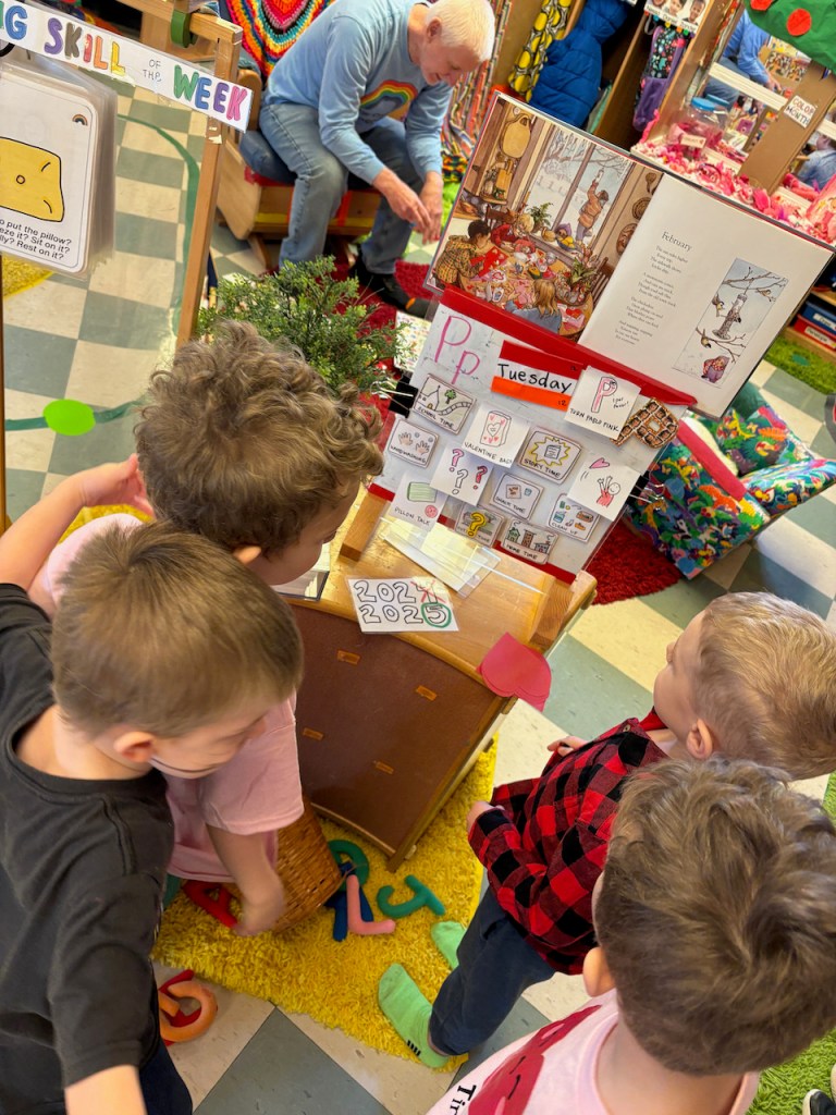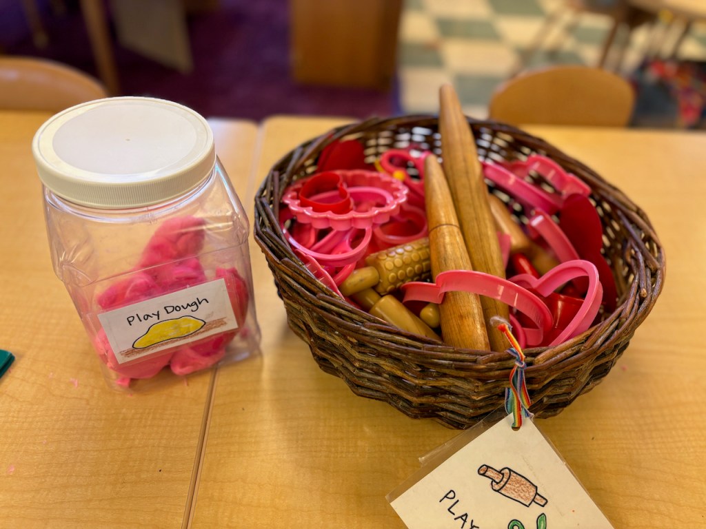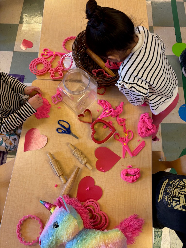 On Tuesday we welcomed February with new pink things in the room and new books on the shelf. Pablo is our new Alphabet Friend and he’ll turn pink this week! In honor of P week, there is a P shaped balance beam path to walk on, enough pillows for everyone, pink play dough and heart cutters, pink water play table, pink scoops and treasures to find in the cloud dough, pretend pizza in the Family Corner and puzzles galore!