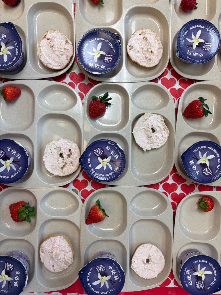 Morning class: Thank you to Max for bringing bagels with pink strawberry cream cheese, Andrew for bringing white vanilla Greek yogurt and Theo for bringing red strawberries!