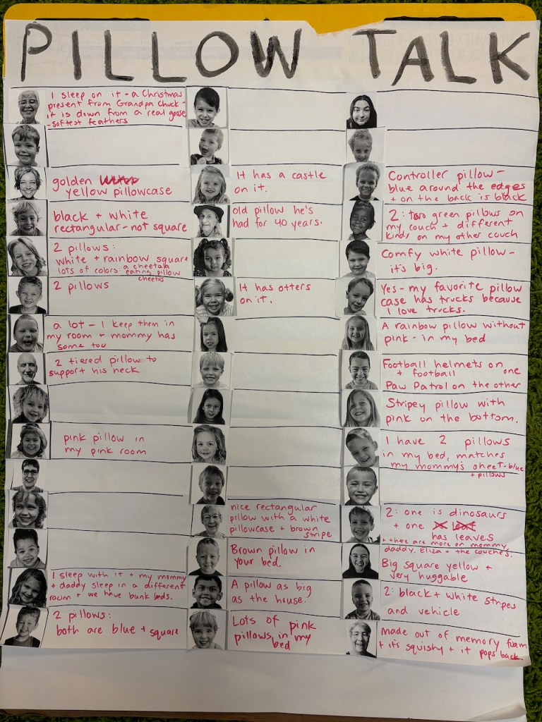 What did you say about your pillow? With our Coping Skill be about using pillows, we started an All School Chart entitled, Pillow Talk (lol). We’ll add to it all week to give every child a chance to tell us about a pillow they like to use or something they like to use instead of a pillow (that’s a thing, you know! A rolled up towel, a bunched up blanket or piece of clothing).