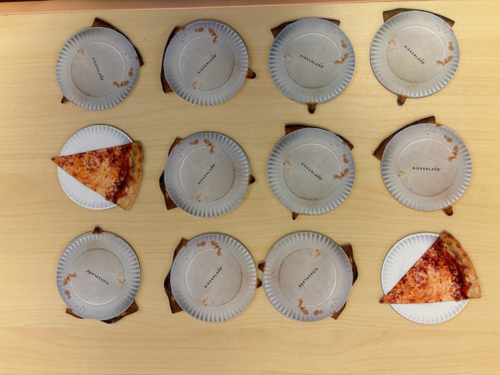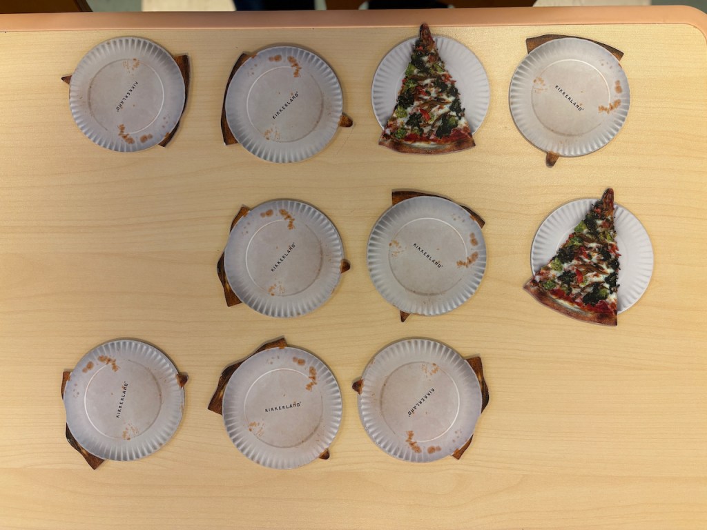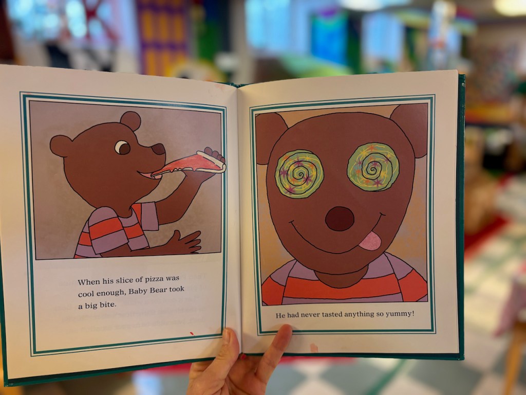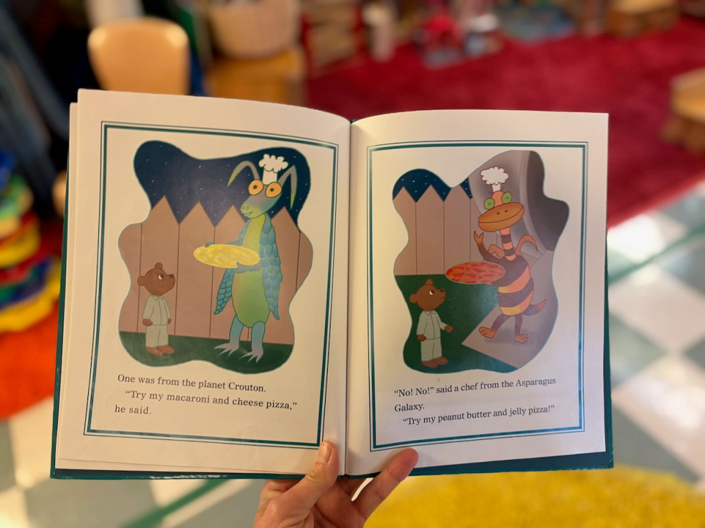 Pizza! We played a matching game as a whole group and managed to find all the matches. The pizza game had three kinds of pizza: cheese, pepperoni and veggie. Those weren’t as silly as the ones in our book, though: