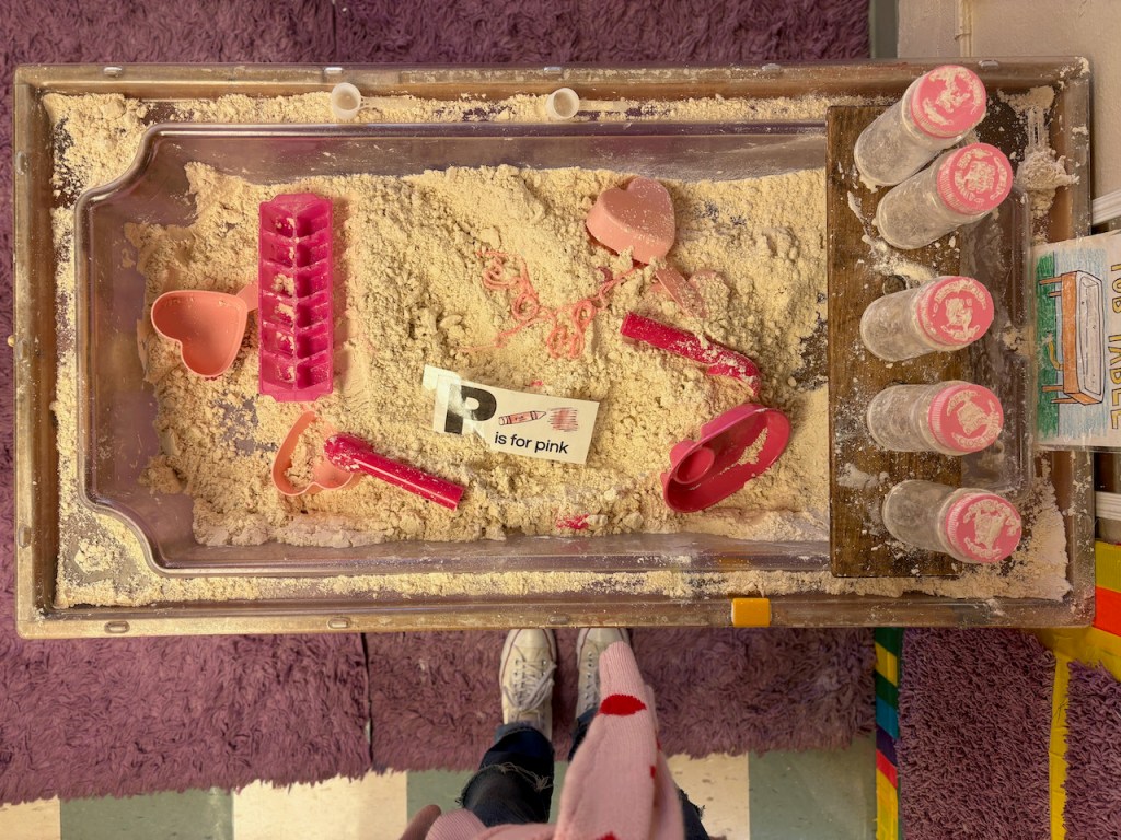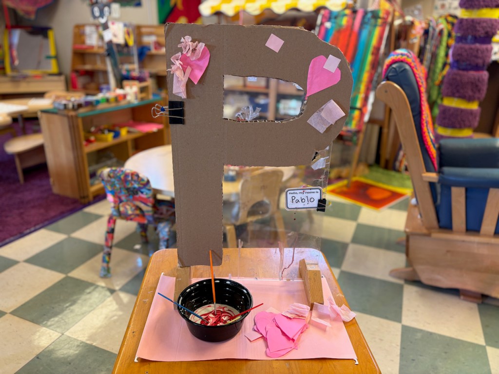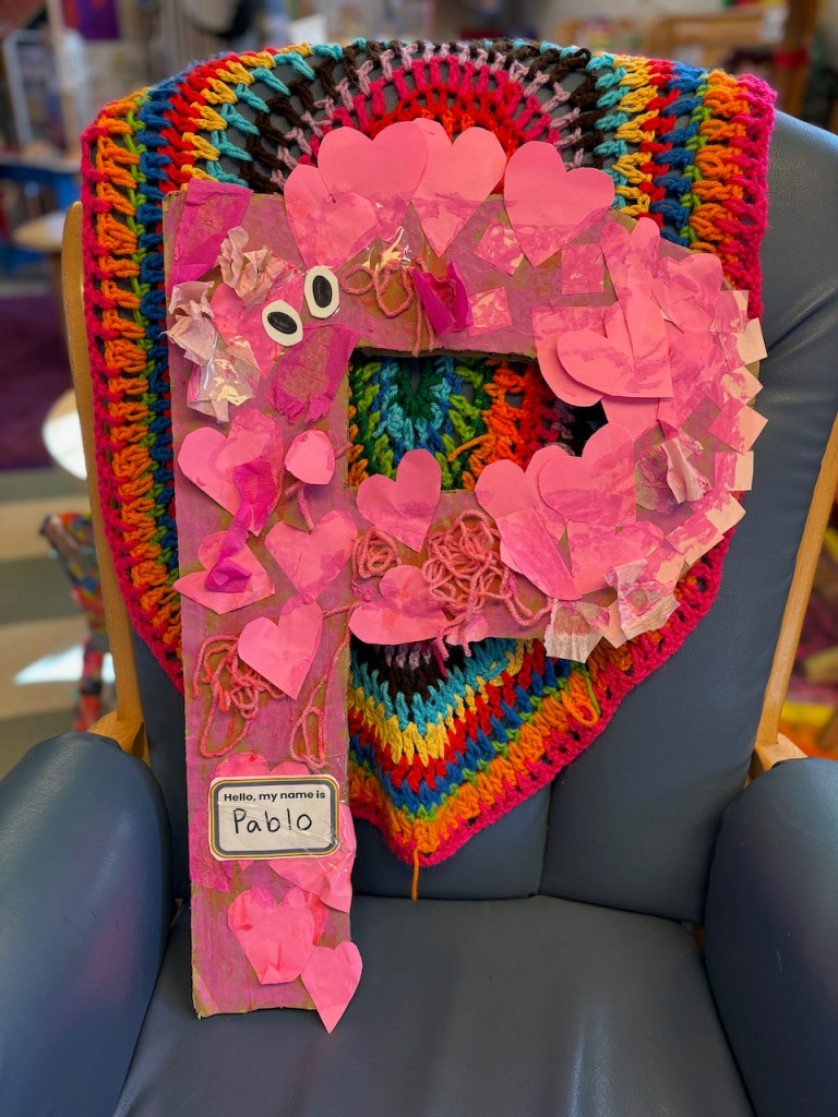 On Thursday, Pablo, our new Alphabet Friend, was all the way pink and got his eyes and name tag! We finished up P week with the P shaped balance beam path to walk on, enough pillows for everyone, pink playdough and heart cutters, pink water play table, pink scoops and treasures to find in the cloud dough, pretend pizza in the Family Corner and puzzles galore!
