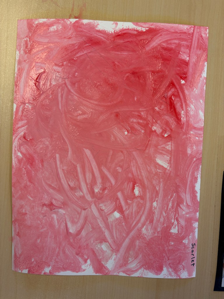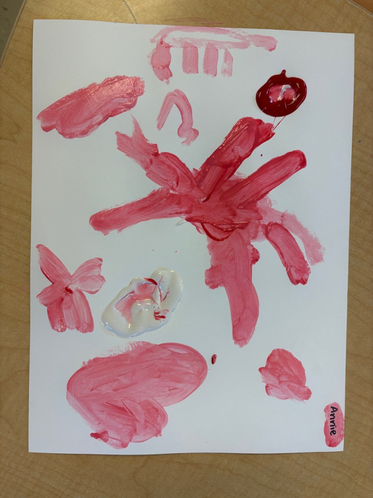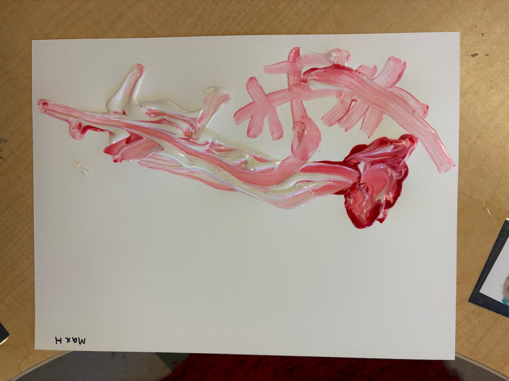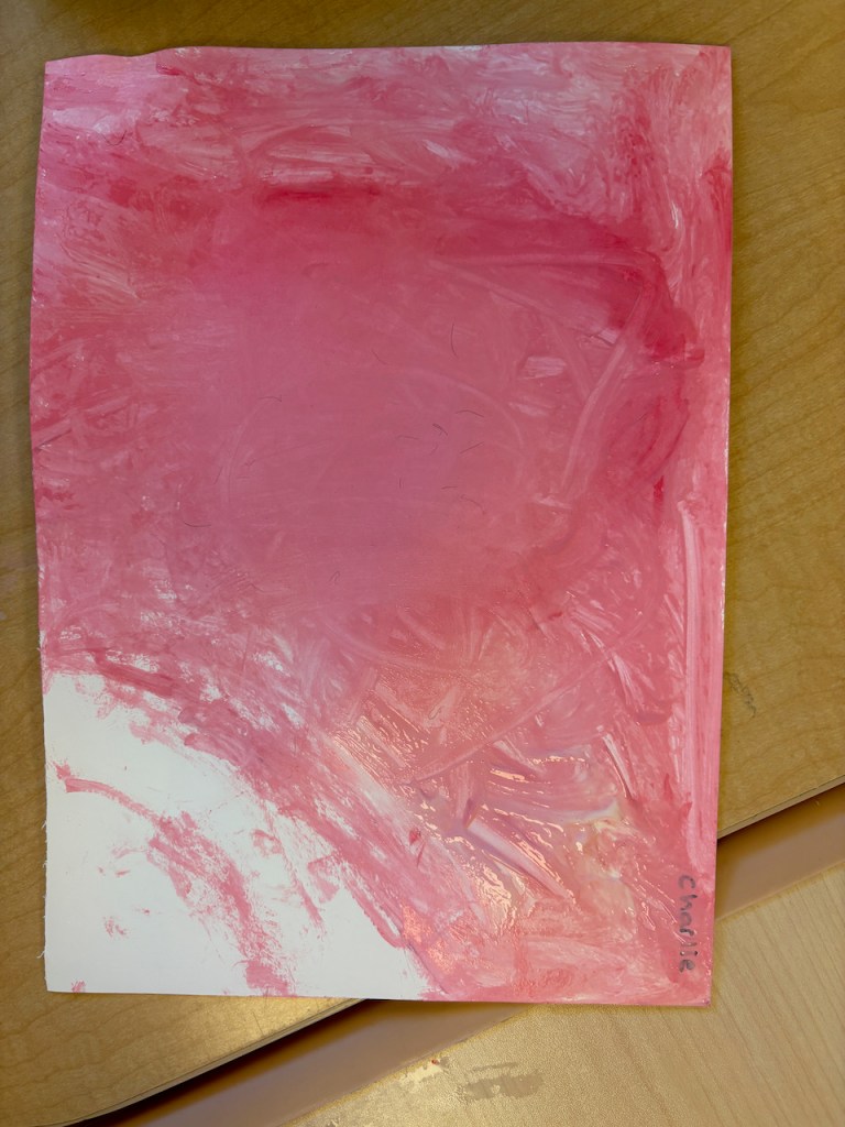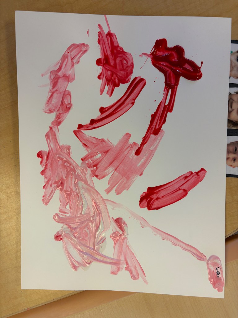 The children were given a paper with a blob of red on one side and and blob of pink on the other. They dipped back and forth or slid the paint together to create masterpieces that will need a weekend to dry.