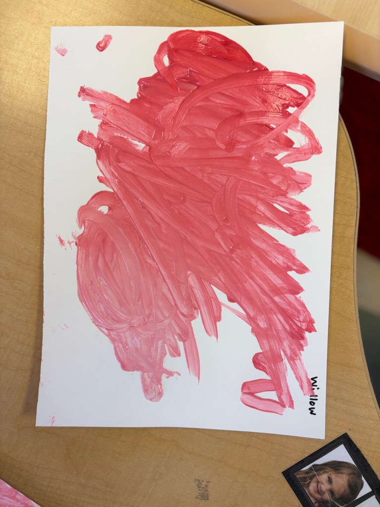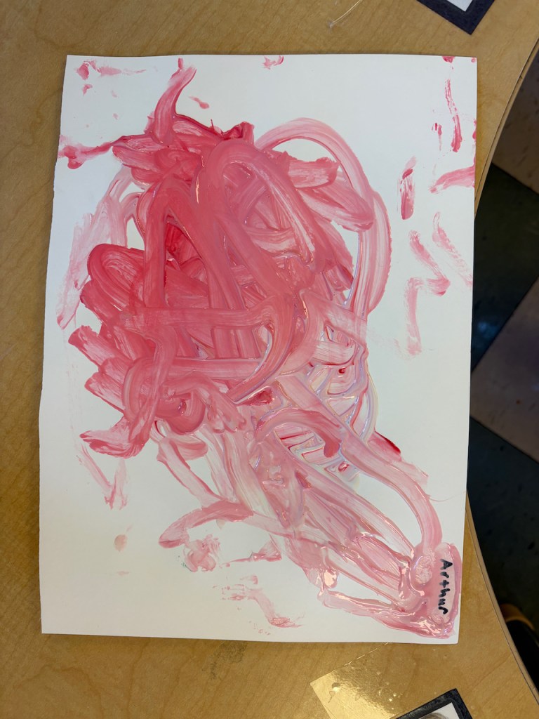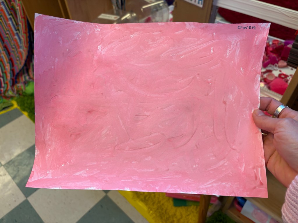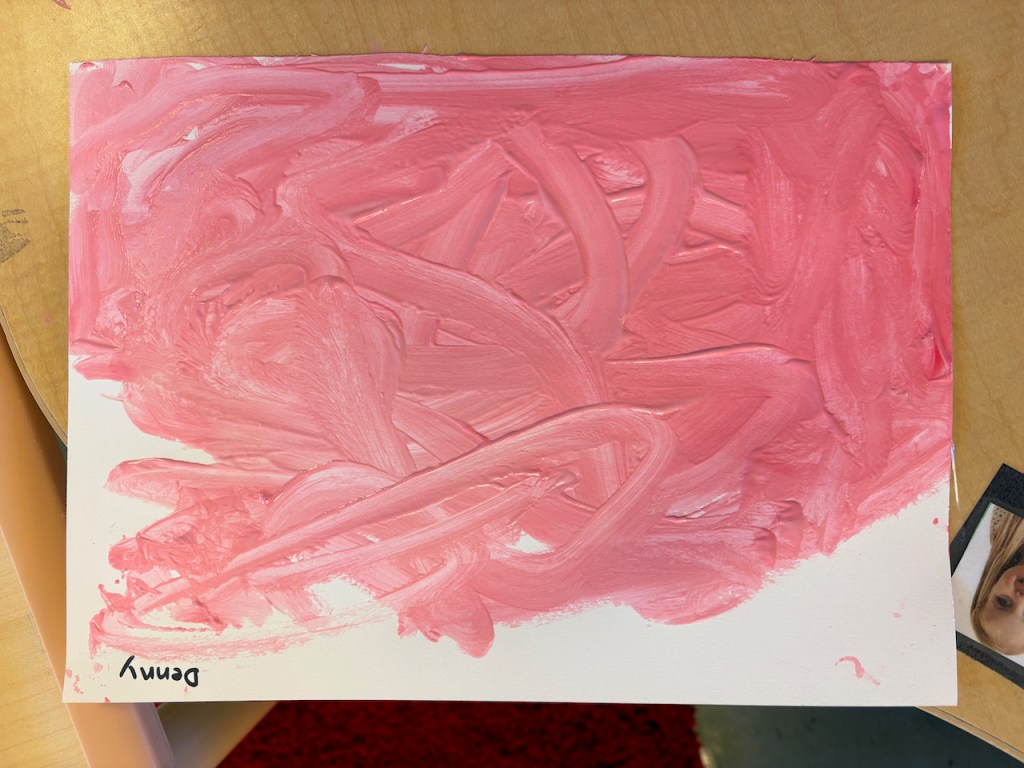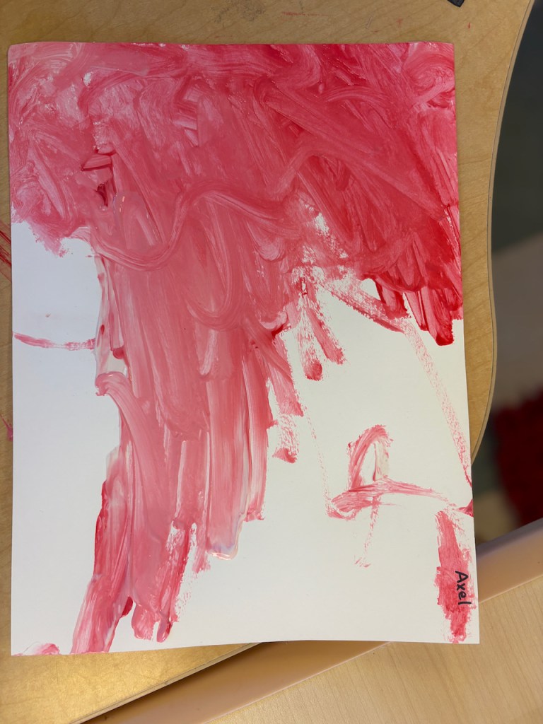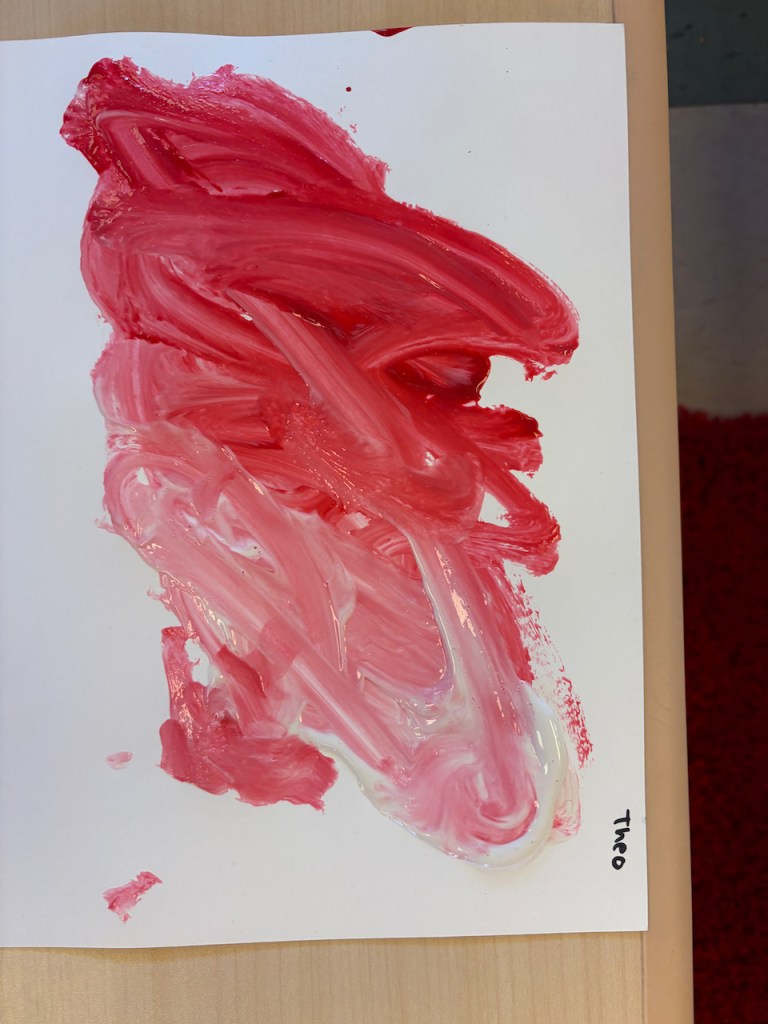 The children were given a paper with a blob of red on one side and and blob of pink on the other. They dipped back and forth or slid the paint together to create masterpieces that will need a weekend to dry.