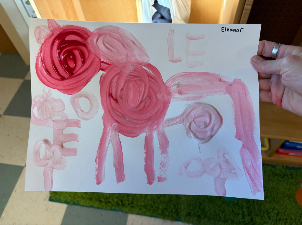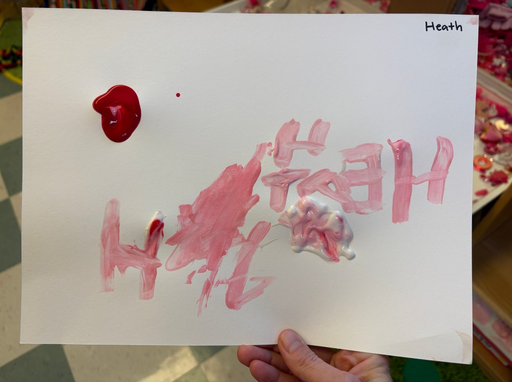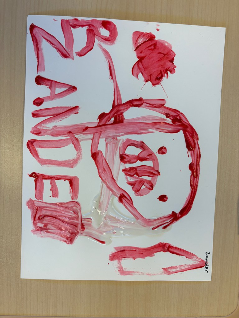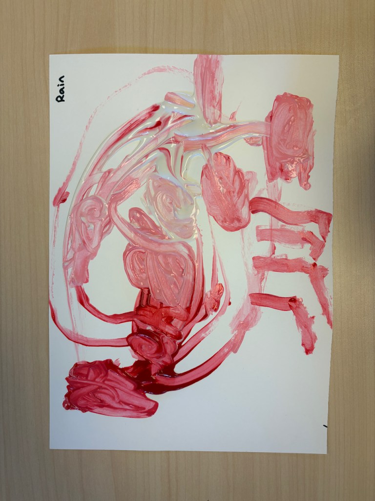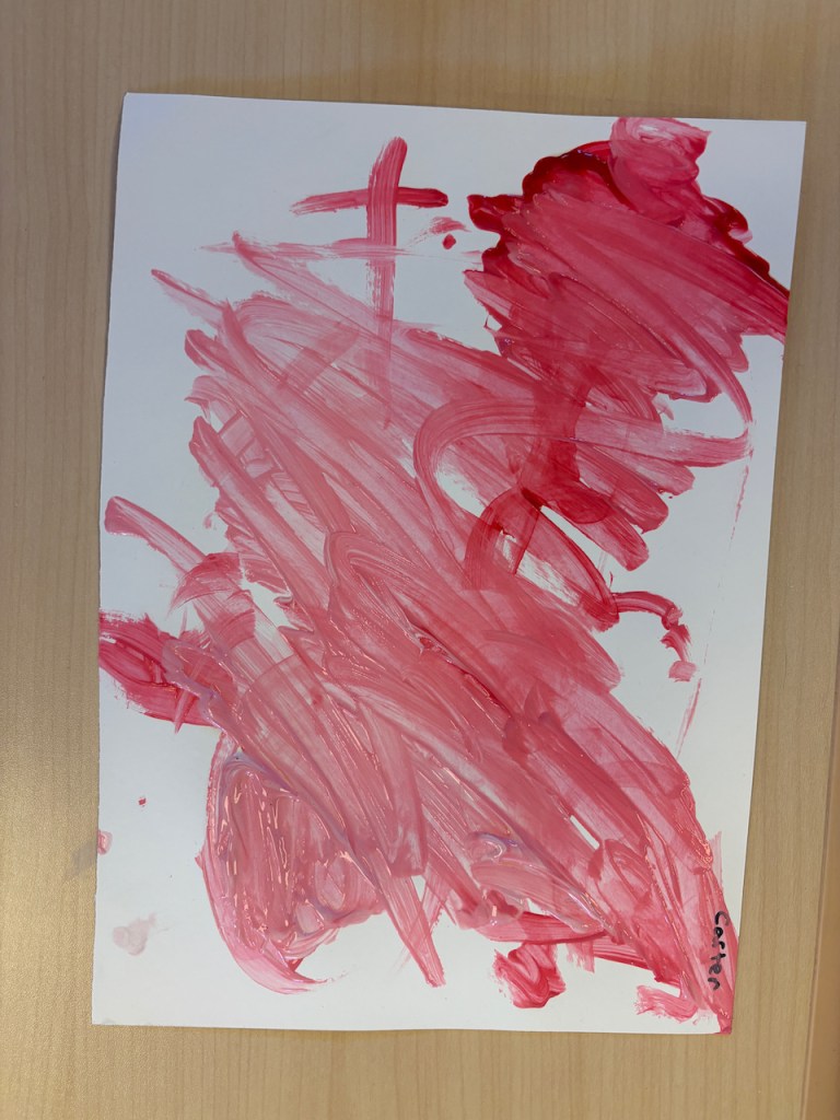 The children were given a paper with a blob of red on one side and and blob of pink on the other. They dipped back and forth or slid the paint together to create masterpieces that will need a weekend to dry.