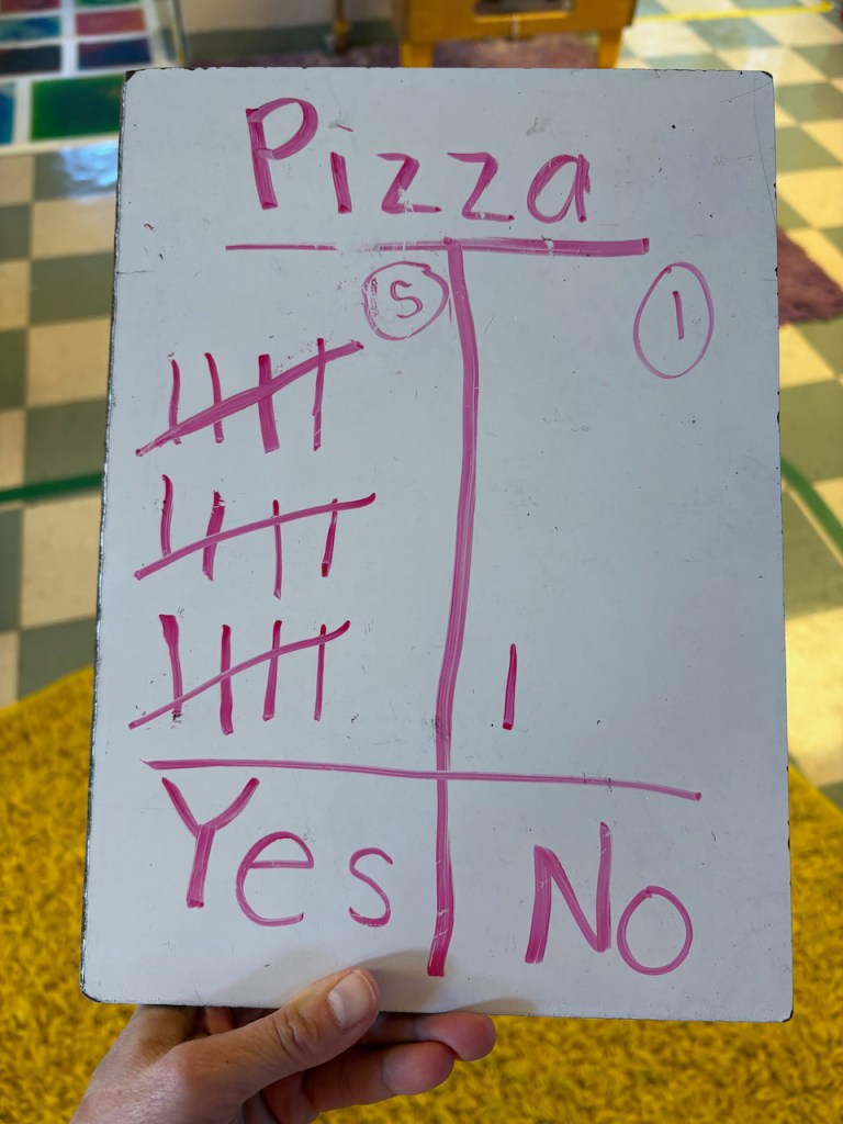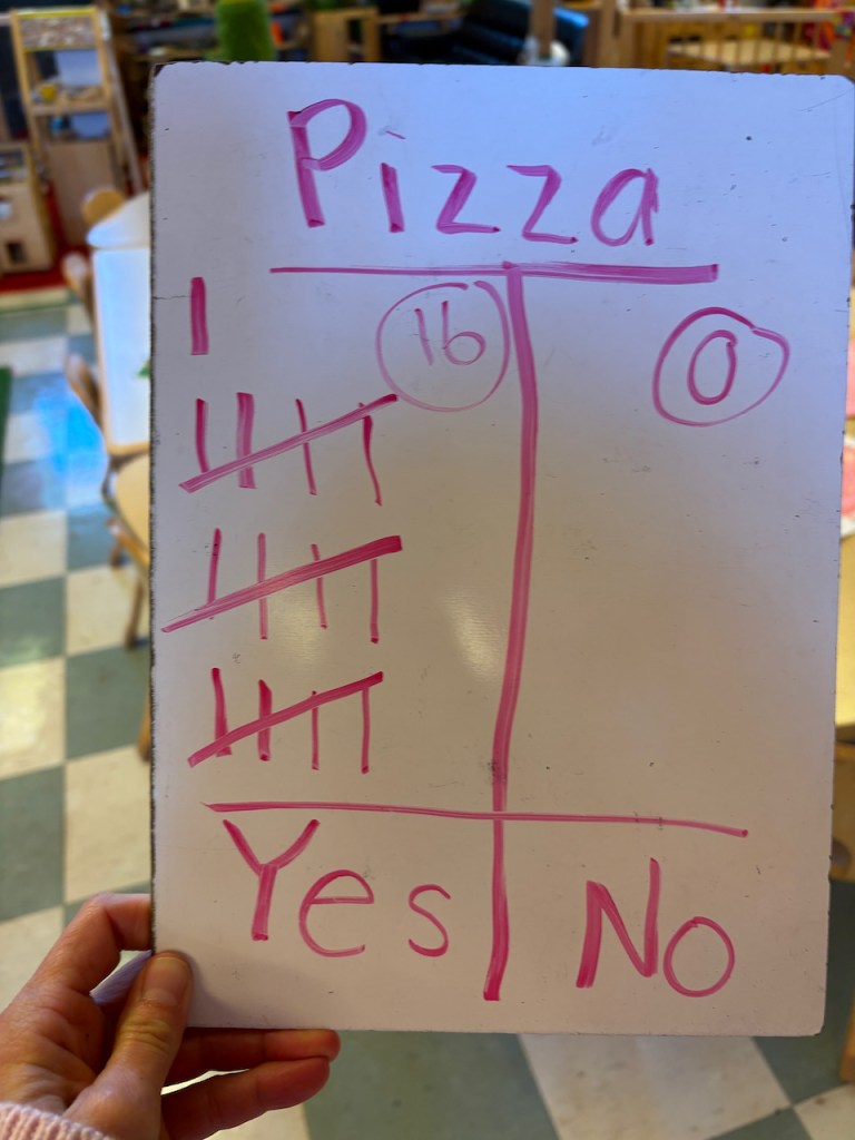 In our book, Pizza, Baby Bear had never tried pizza before. Before we read the book, we made tally marks to notate who of us has and has not tried pizza before (not whether or not we liked it).