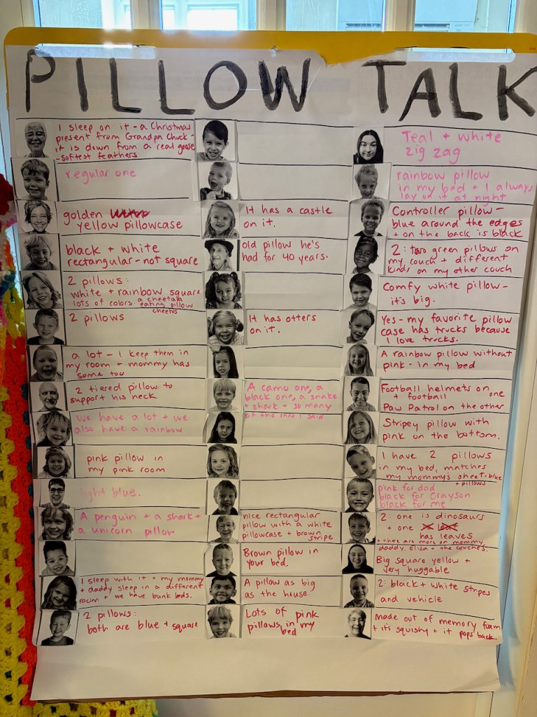 Our Coping Skill is Pillow Time. It can be helpful for figuring out what our bodies need in a certain moment by picking up a pillow…notice does it feel good on your belly or to squeeze or to hold? We added more to our All School Pillow Talk Chart…these kids sure know about their own pillows!