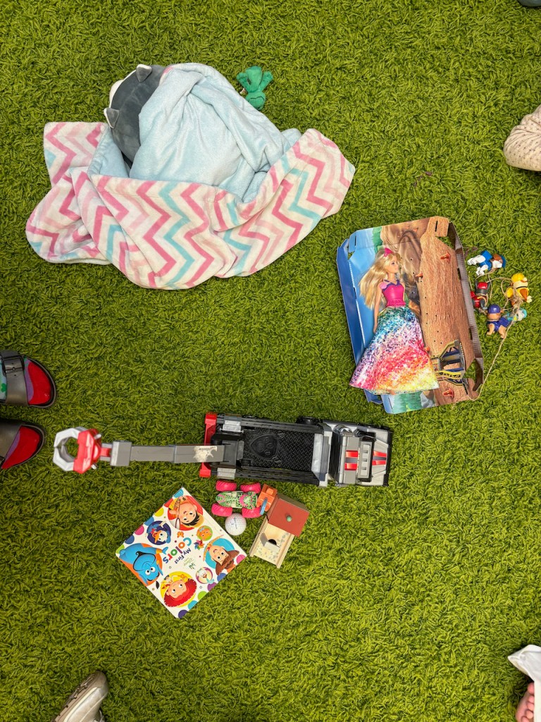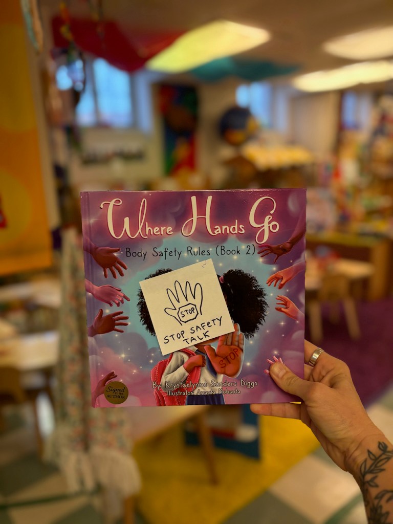 She wanted someone to stop doing something. Some people call hugs “squeezes.” We used Story Time as a time to talk about body safety and a child’s right to say no to a hug or any other touch. I’m guessing they can show you the stop hand and voice we practiced today, including the serious face and strong voice, “I said STOP.”