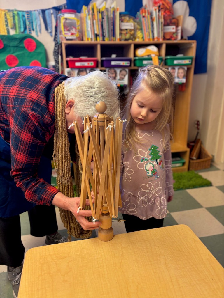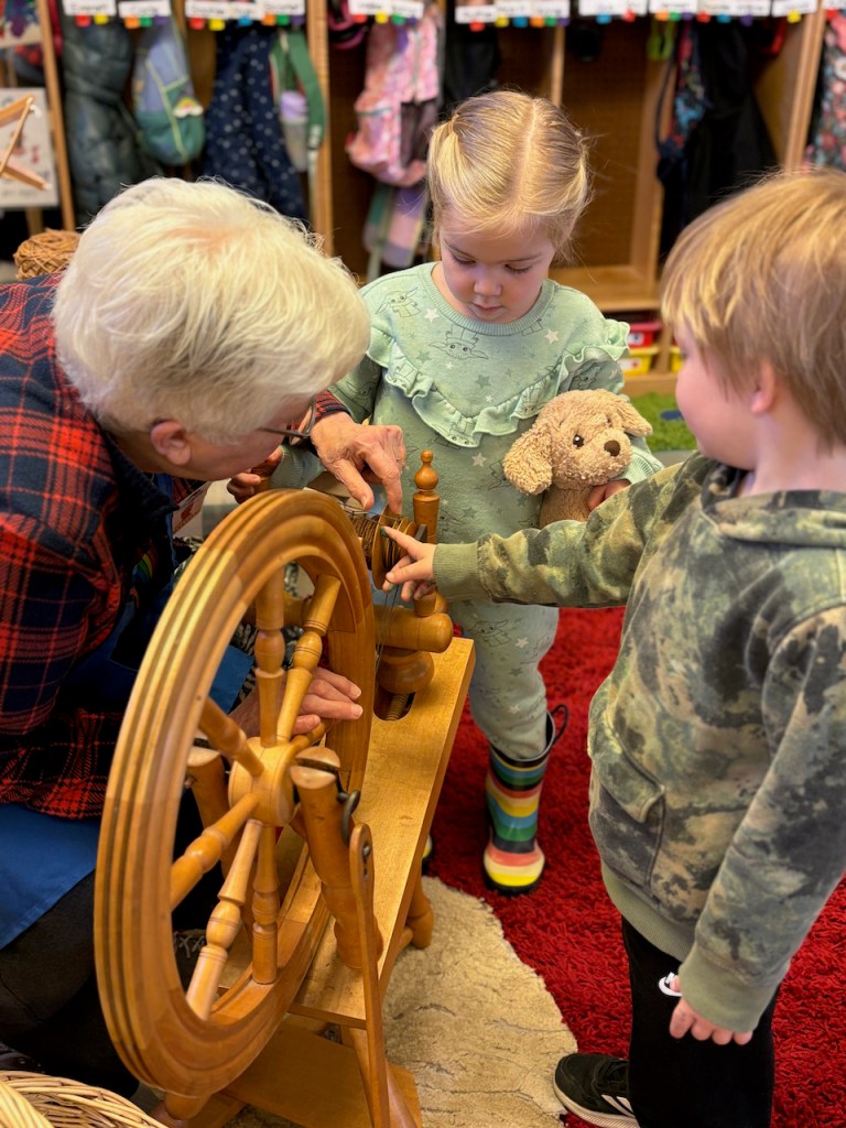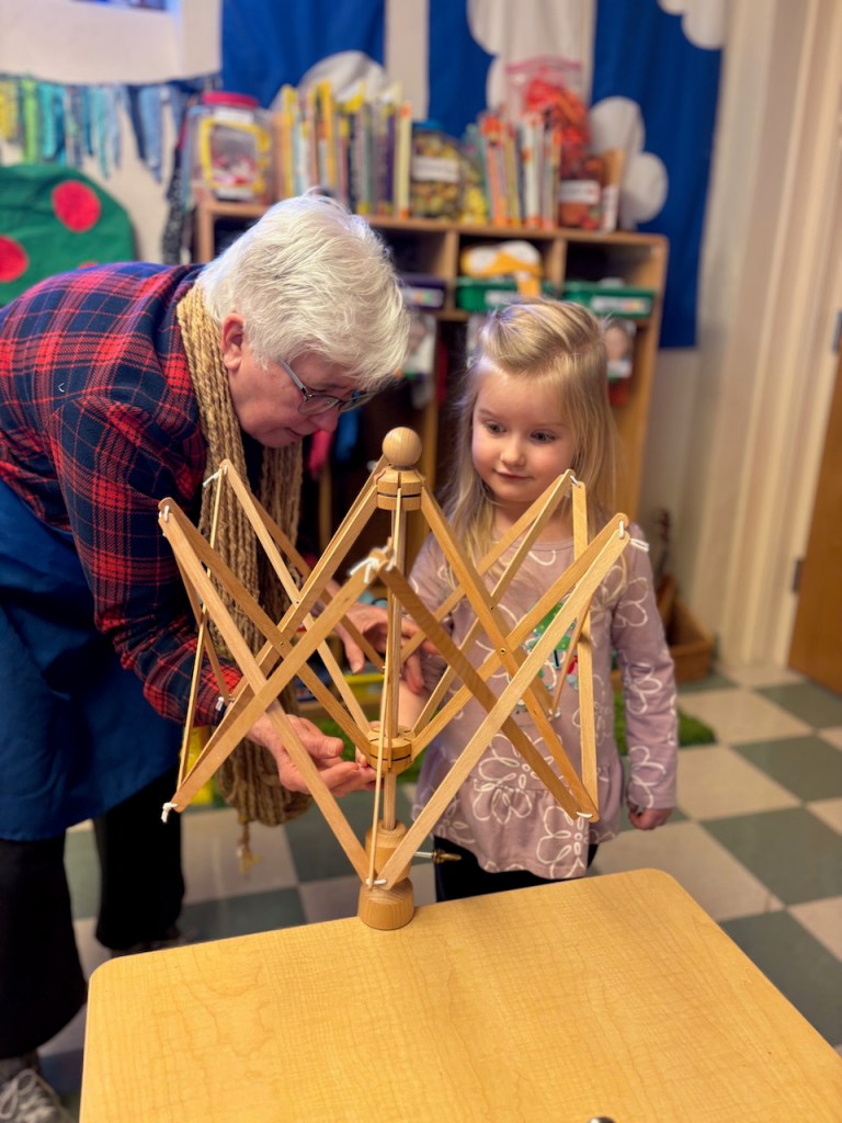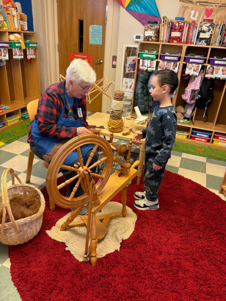 Grandma Bonnie was back with her spinning wheel and umbrella swift yarn winder. The children love watching and helping…some are very curious about the mechanics of it all!