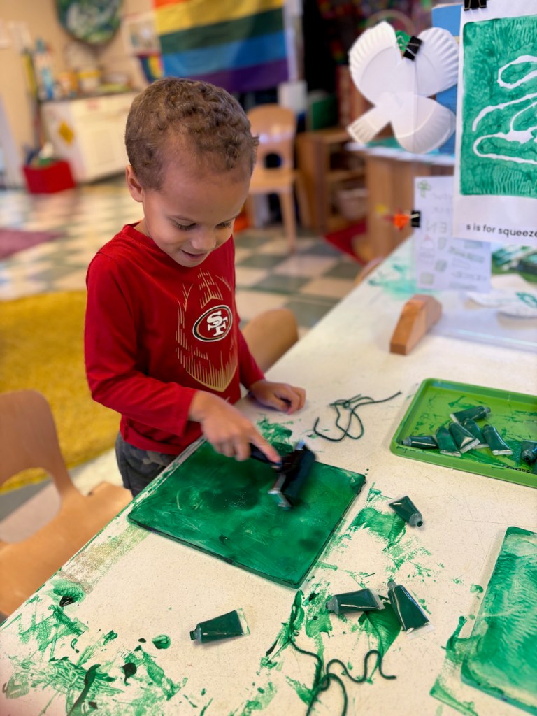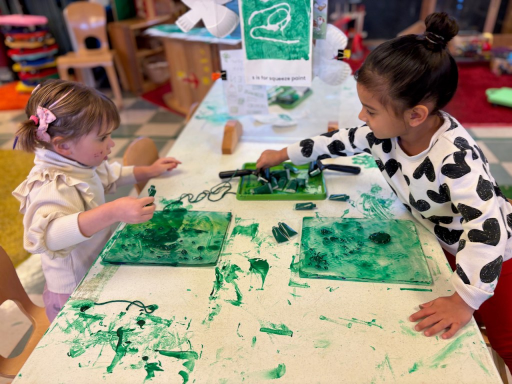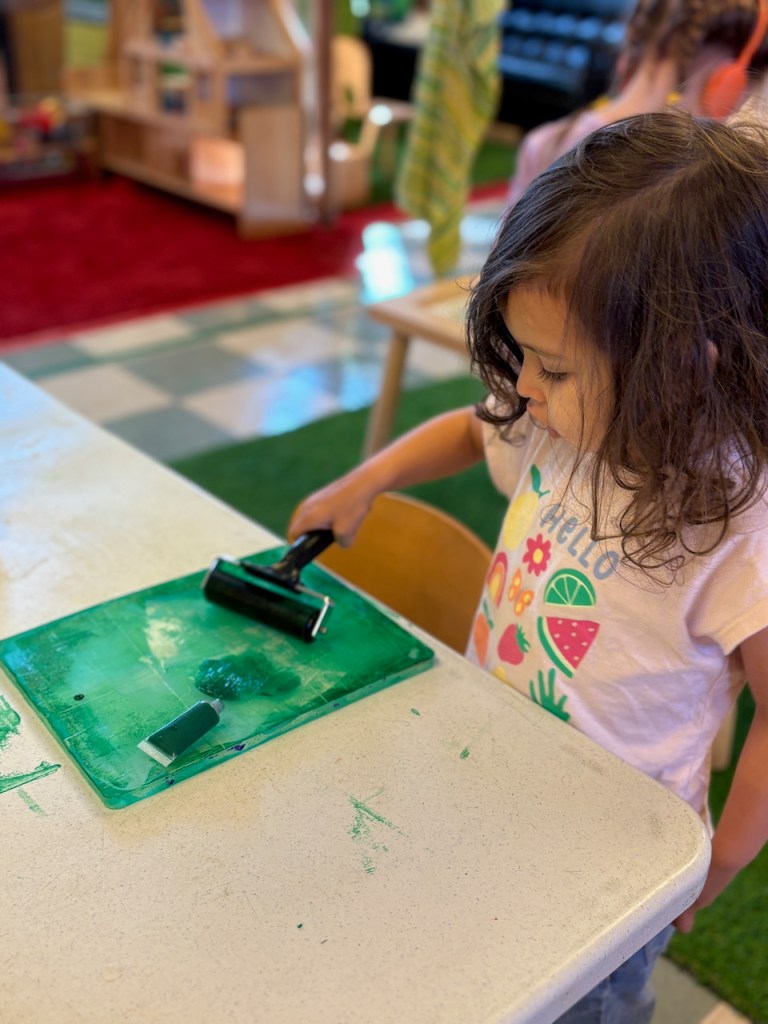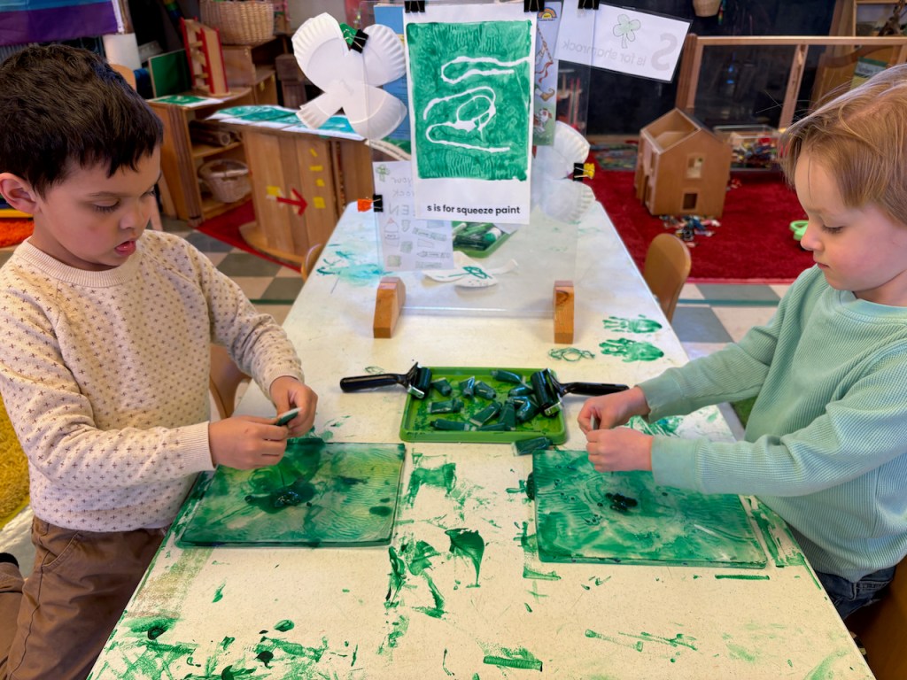 By squeezing it! We had paint in tiny tubes that had to be squeezed very hard to get the paint out before rolling it smooth with our brayer rollers. Children could also add strings (we called them snakes) before making a print. What great muscle work resulting in beautiful prints.