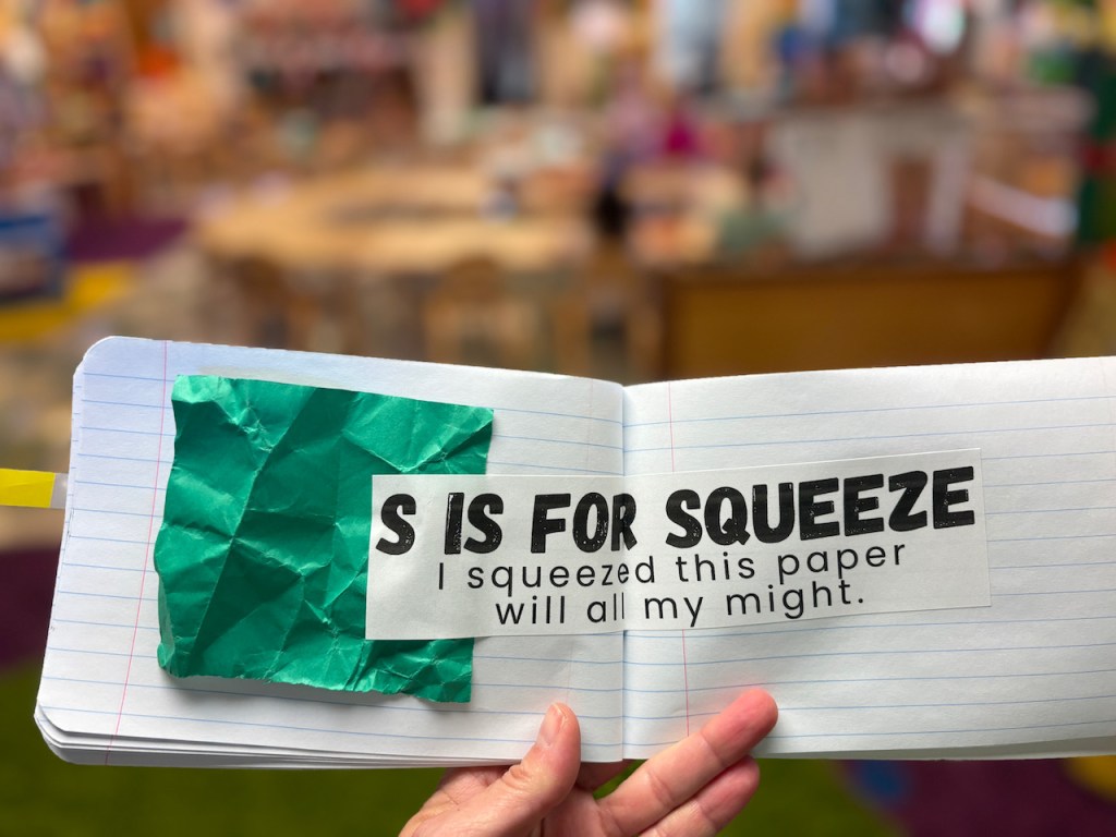 Our Letter of the Week is S and our two Golden Letter friends, Sophie and Scarlet, were both back at school today! Today we focused on squeezing things, including people! We squeezed paper to put in our journals as well (and practiced lining up to wait for a turn with Ms Kristin to put them in our journals). Read on to learn more about that.