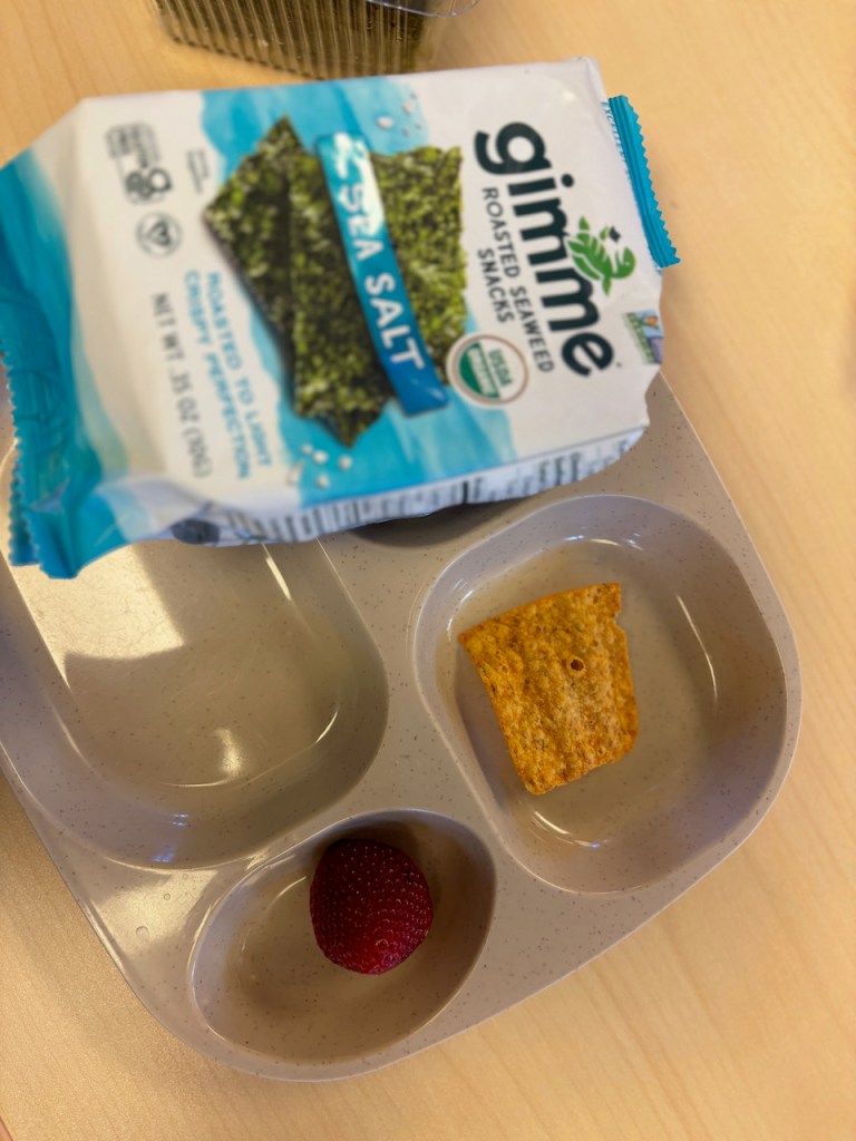 Morning class: Thank you, Millie for a wonderful S snack: Sun Chips, strawberries and sea salt seaweed!