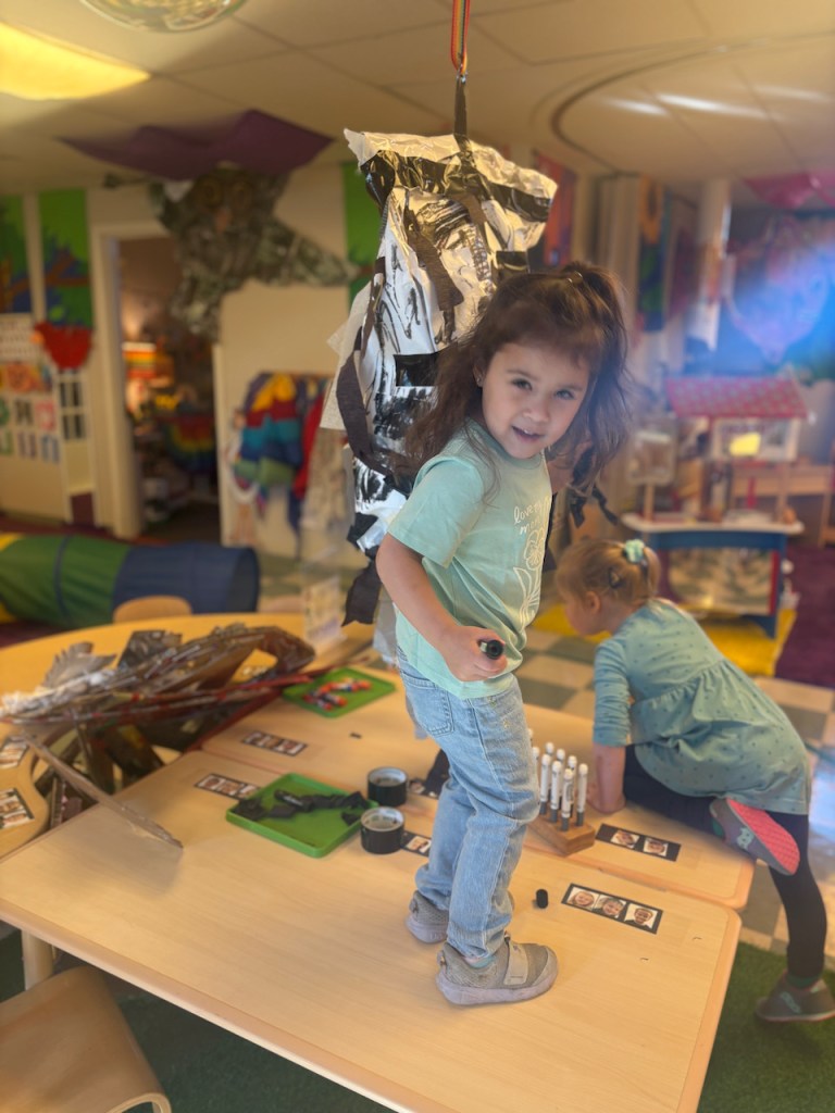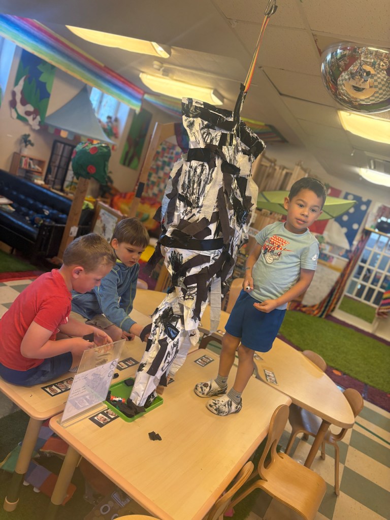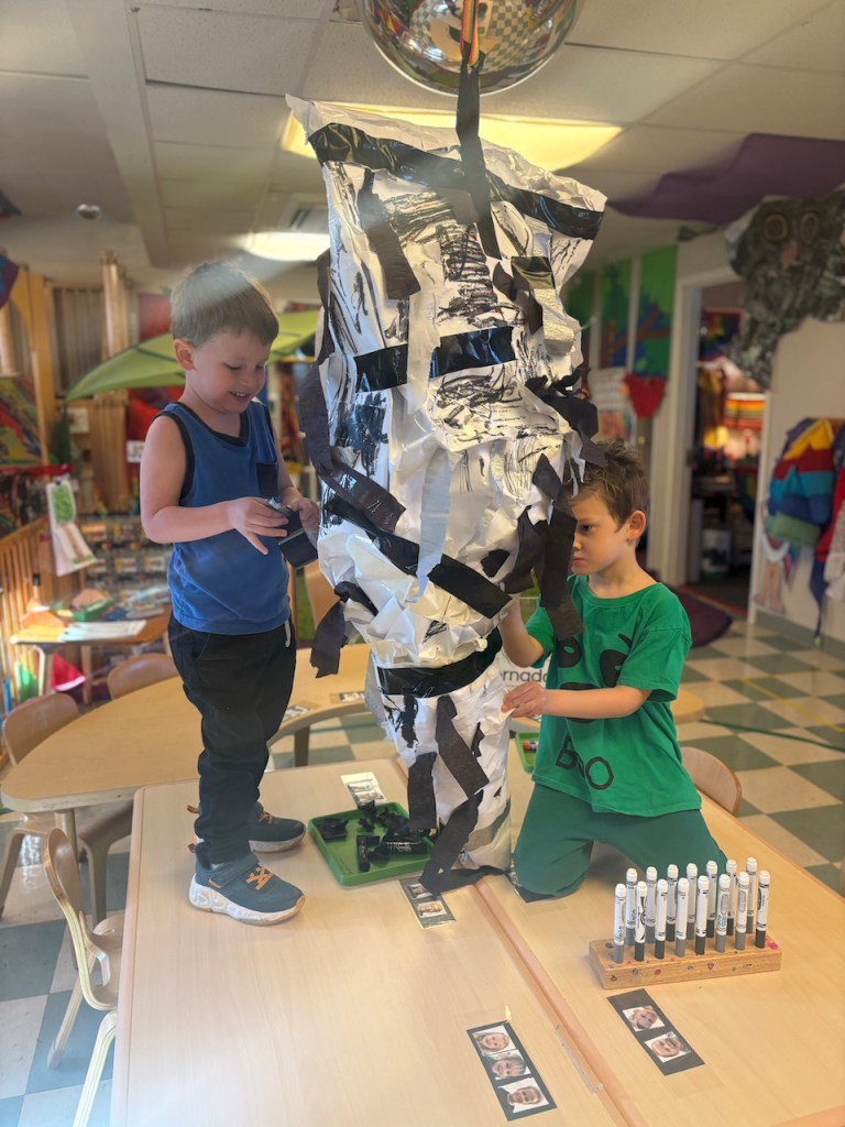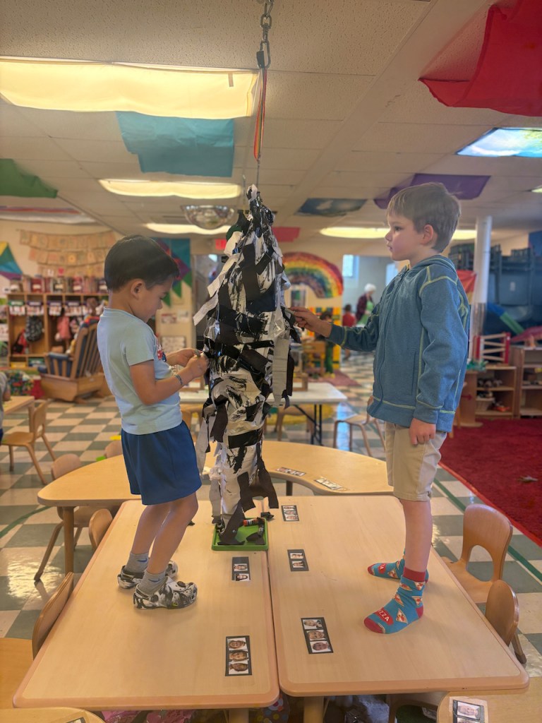 There is a pretend tornado that we can color and paint while it spins from a hook on the ceiling. To reach to the top, we moved the tables together so YES, children stood on the table today!