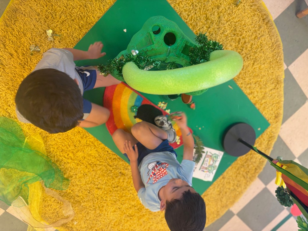 This week we are celebrating the letter T and St Patrick’s Day with Tom Tom the Leprechaun as our theme. This pretend character loves rainbows, the color green, gold and being outside in the trees. How fun that we still have a lot of green around since it is March’s Color of the Month: the playdough and tools are green, the Tub Table has green digging and sculpting tools, and all the Tiny Things. Our new Alphabet Friend is Terry who will be covered in tape this week! We have two tunnels to crawl through.