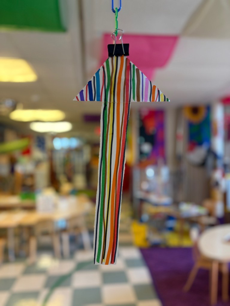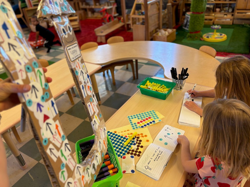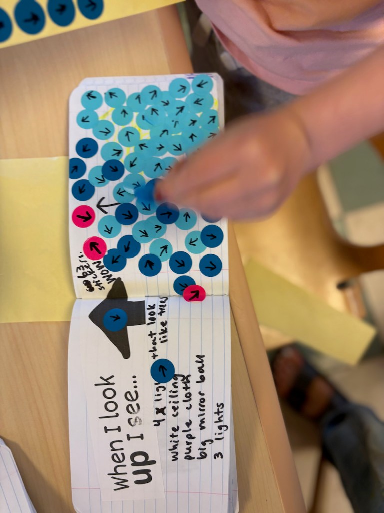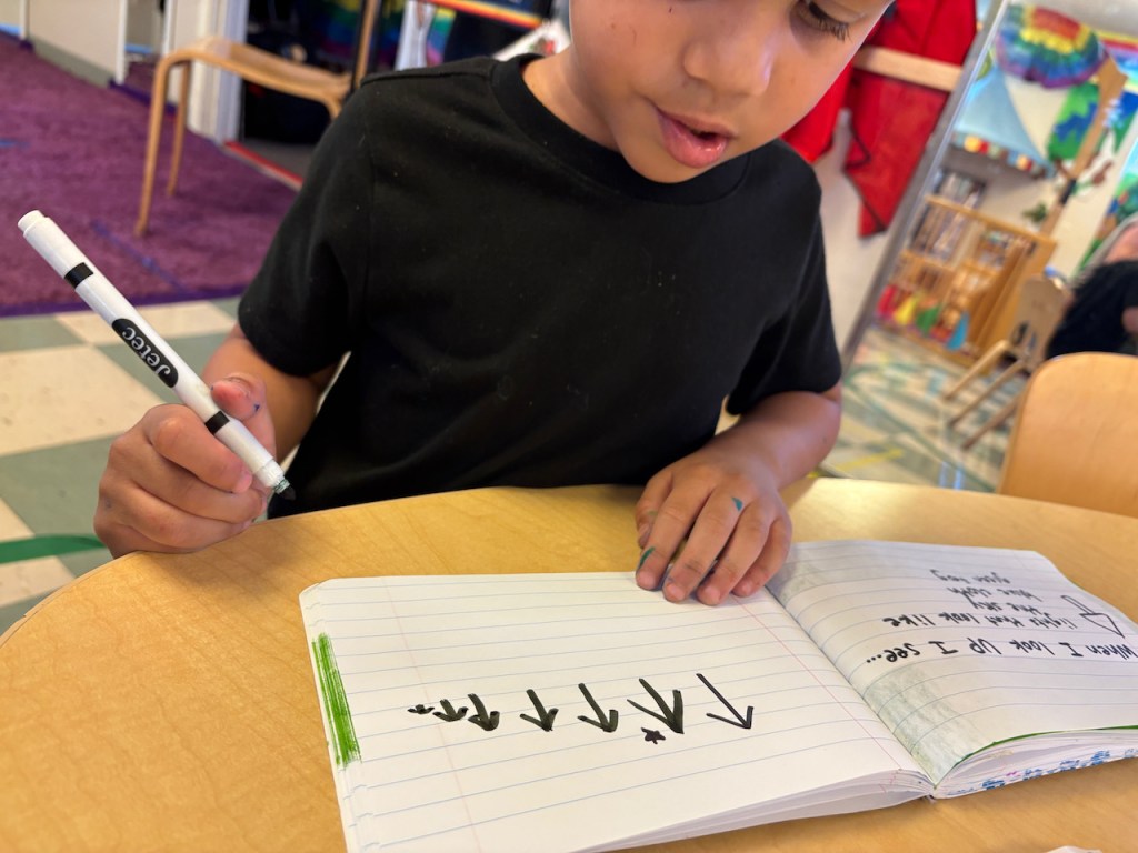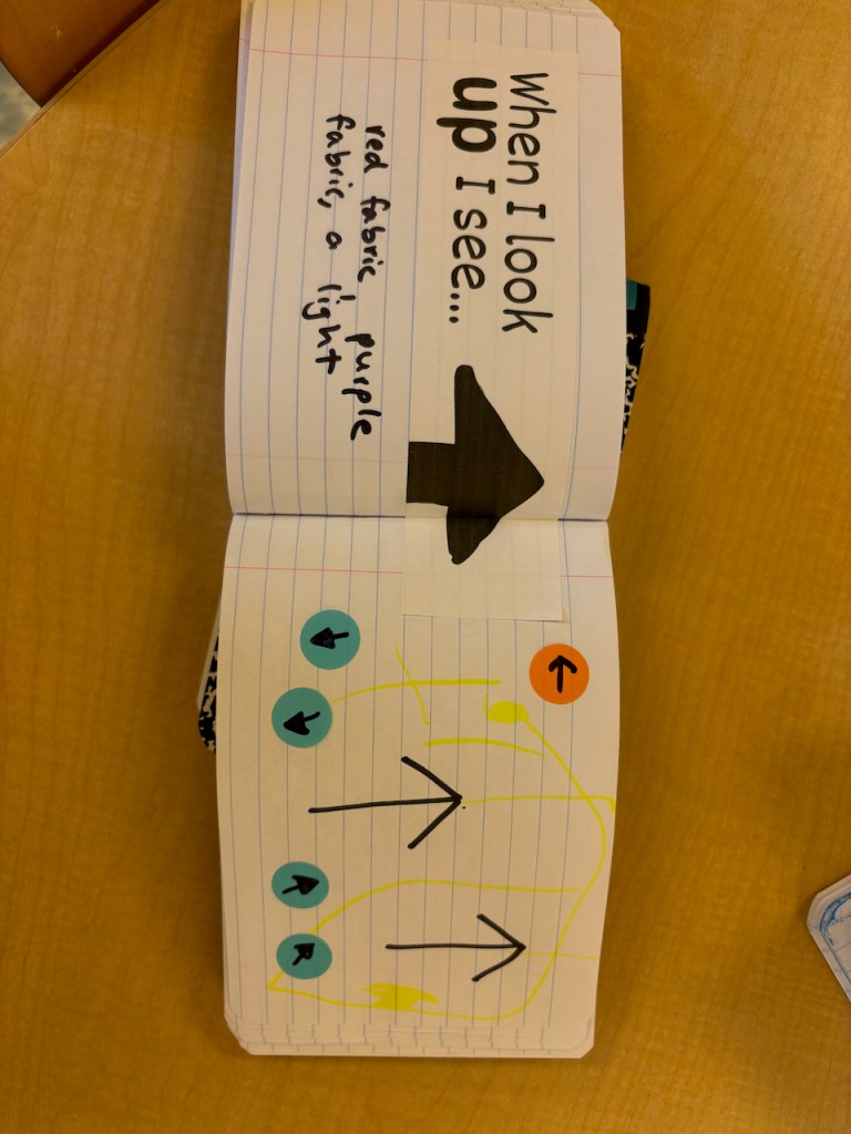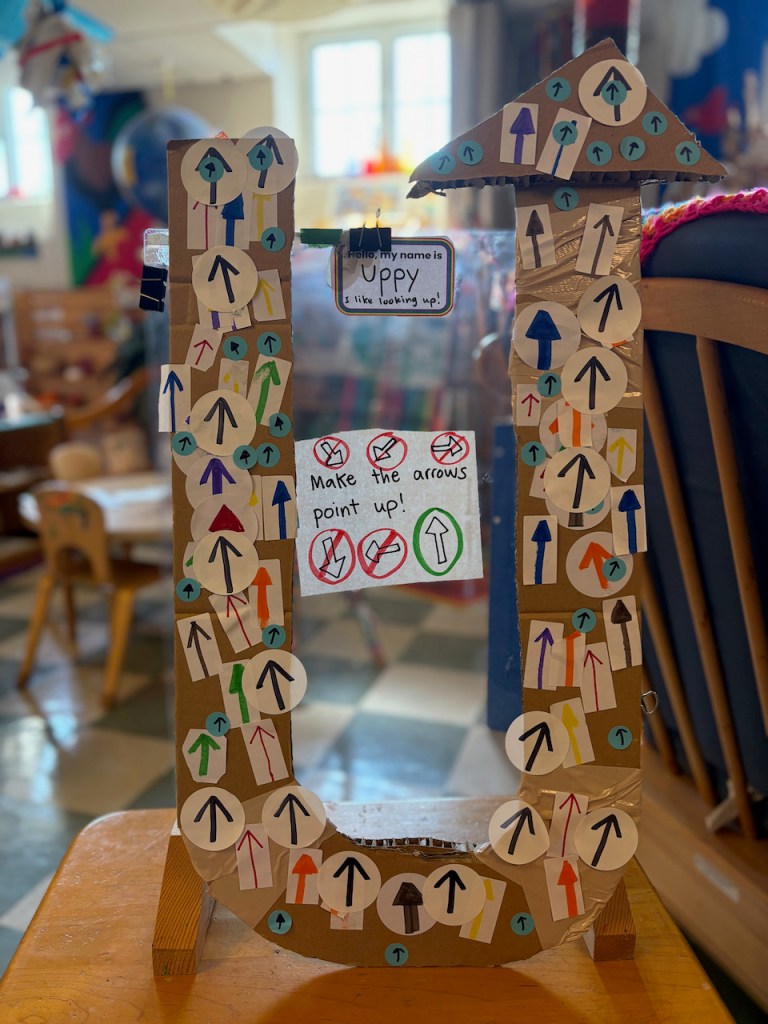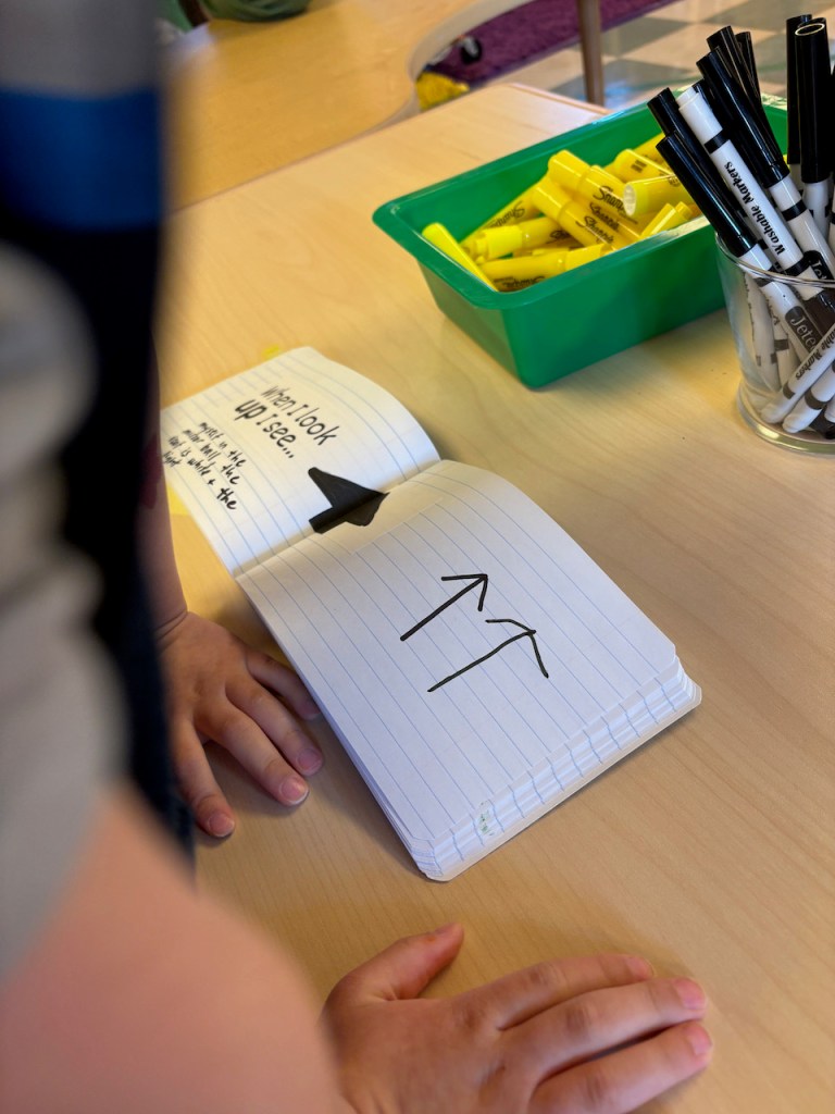 LOOKING UP: We worked in our journals making arrows pointing up and talking about what we see when we look up at our classroom ceiling. Uppy has his eyes and smile and was there to watch!
