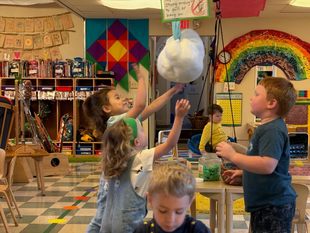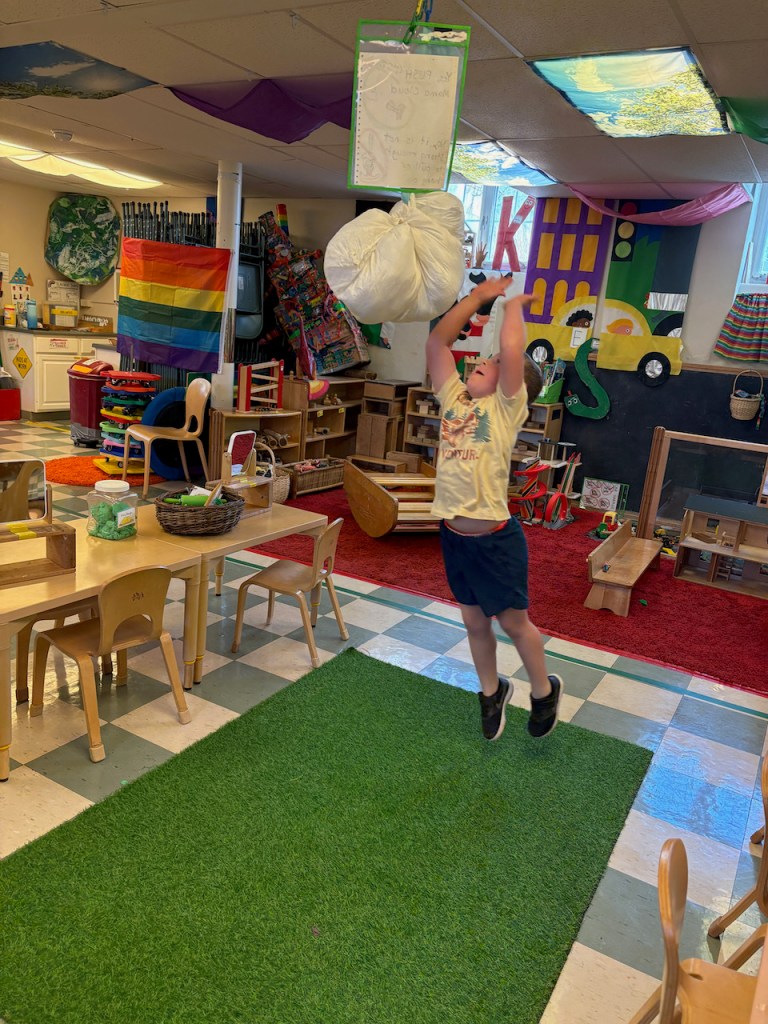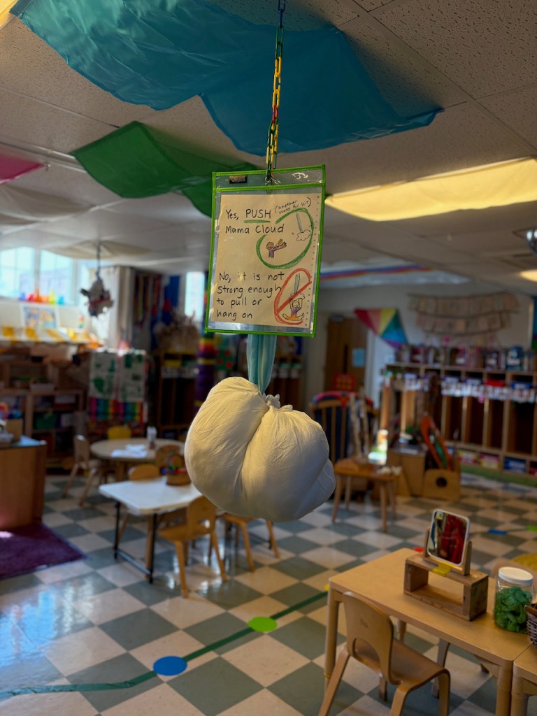 JUMPING UP: With all of our umbrella work, we brought Mama Cloud back in the classroom for us to jump up and push.