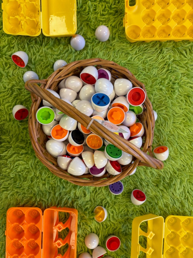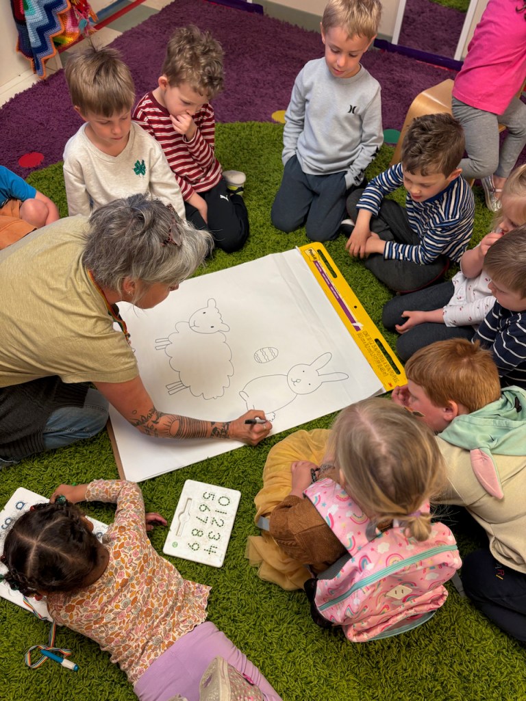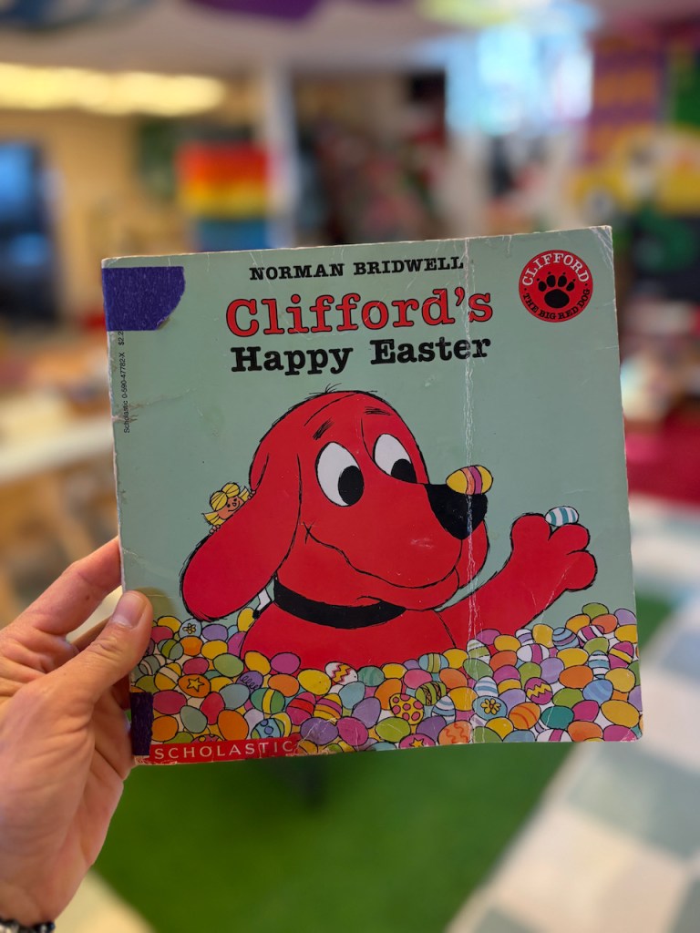 STORY TIME: We read Clifford’s Happy Easter where Emily Elizabeth has a strange dream that Clifford gets all mixed up. Then we sang the chorus of “Baa Baa Black Sheep” but changed the color words to match Clifford’s designs!.