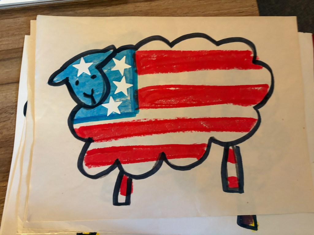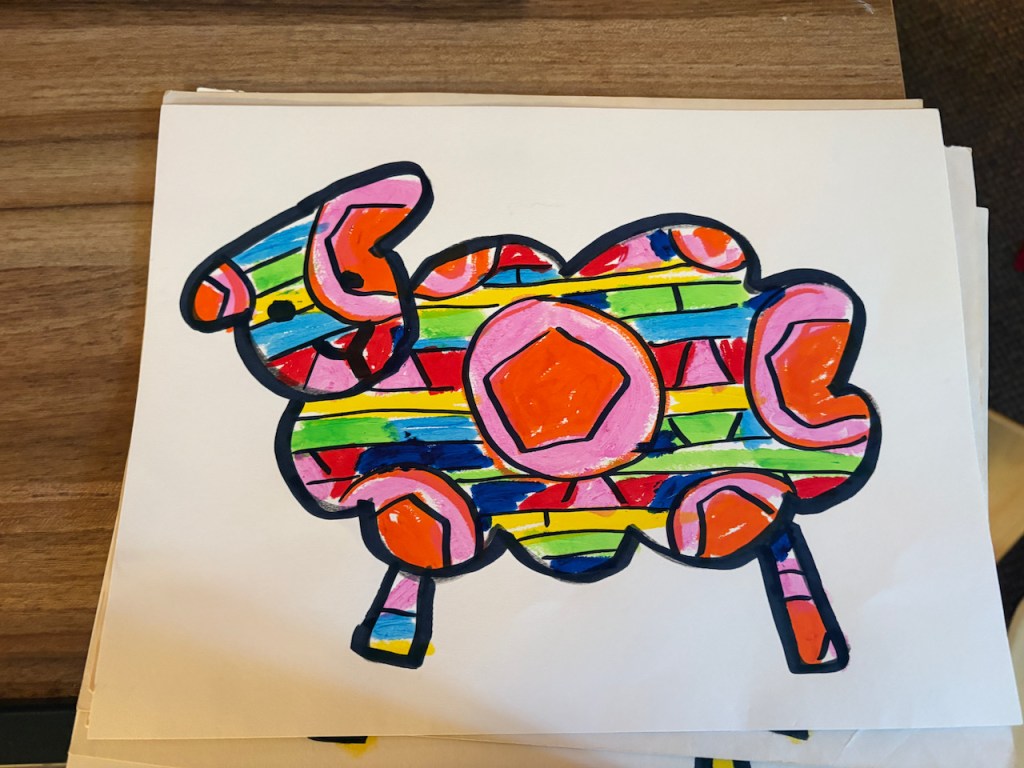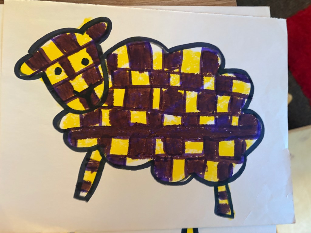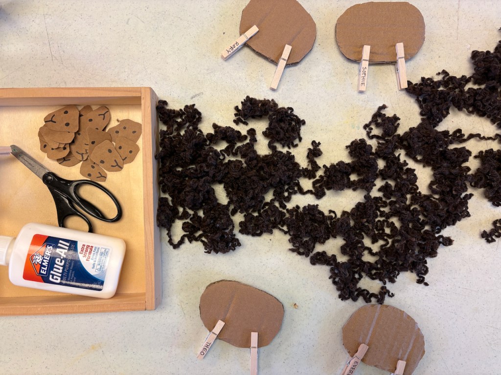 WOOLY LAMBS: We glued fluffy wool on cardboard to make little Easter lambs. Grandma Bonnie got her wool from a real farm from real sheep named Dorito and Edna. The dark brown/black is the natural color of the sheep-it’s not dyed!