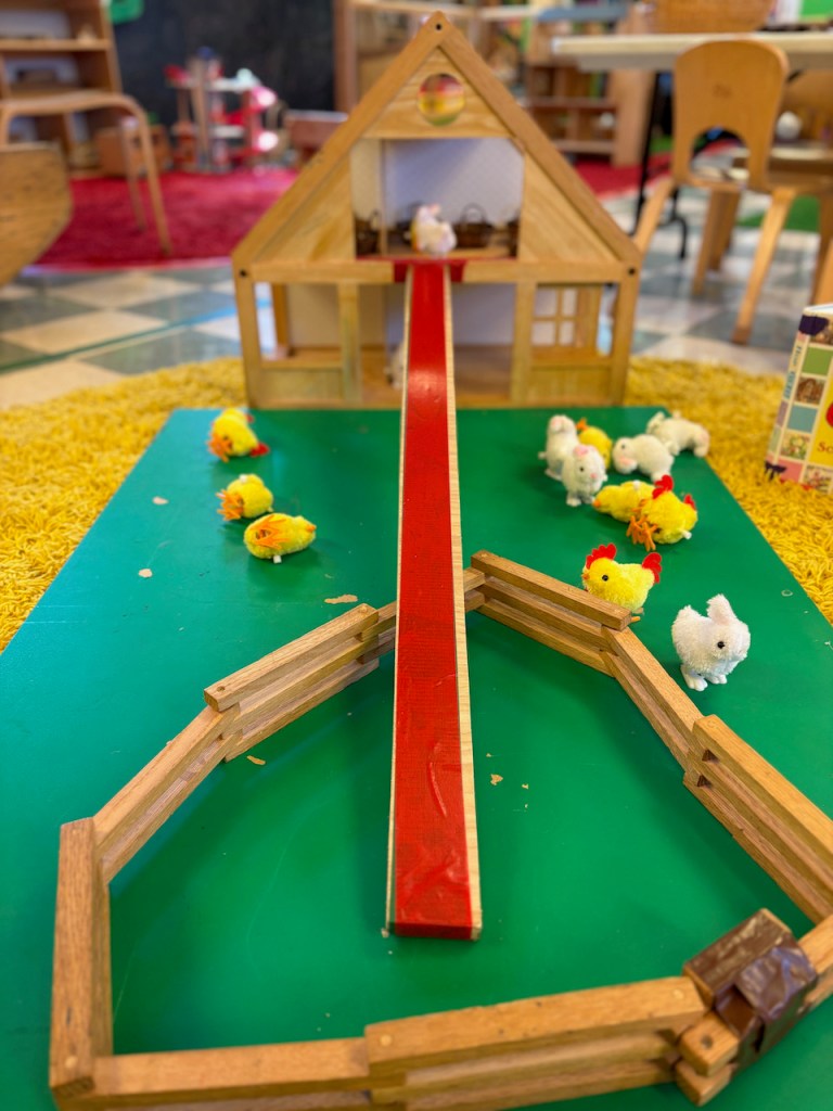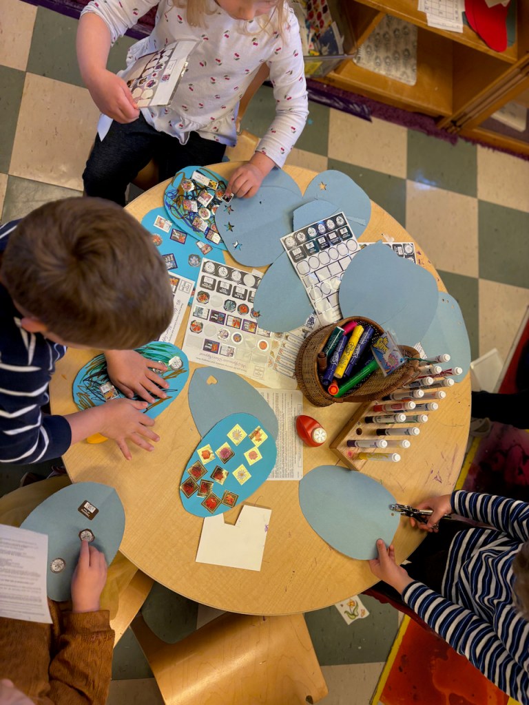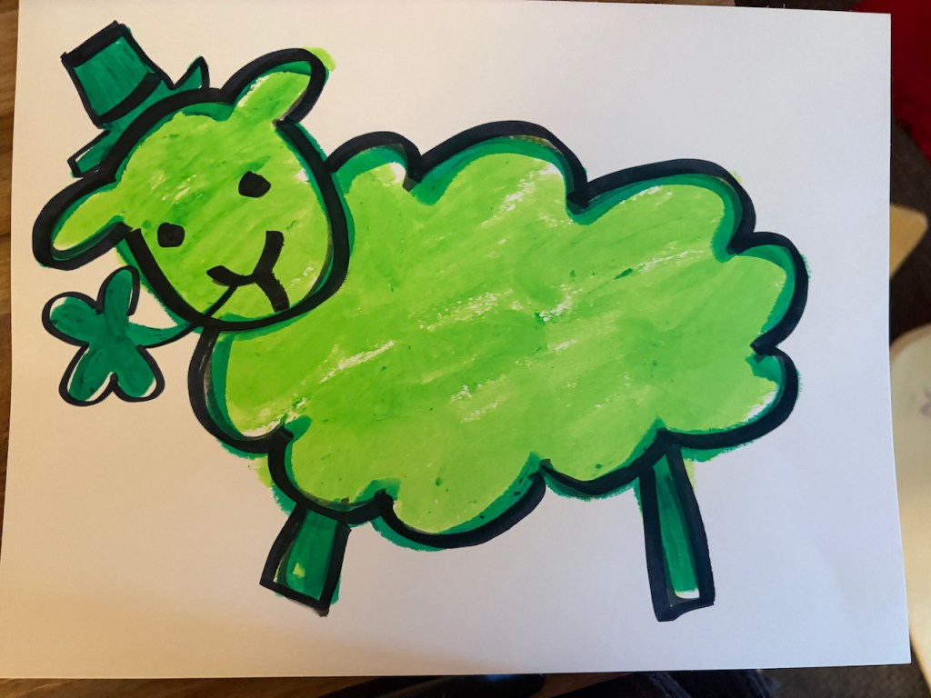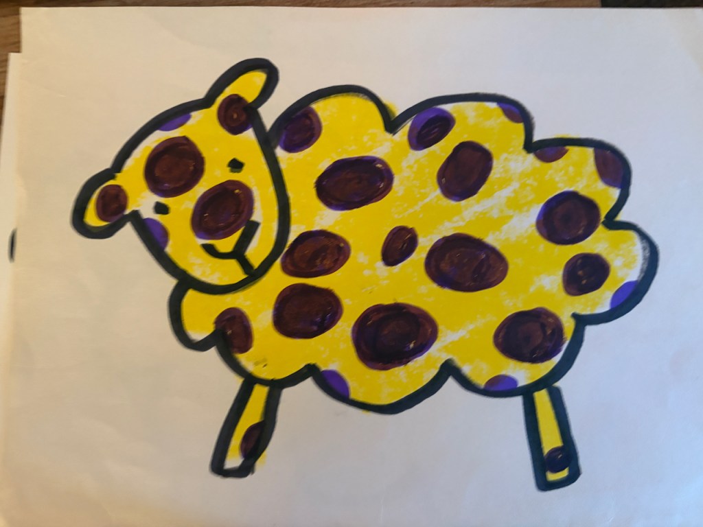 WOOLY LAMBS: We glued fluffy wool on cardboard to make little Easter lambs. Grandma Bonnie got her wool from a real farm from real sheep named Dorito and Edna. The dark brown/black is the natural color of the sheep-it’s not dyed!
