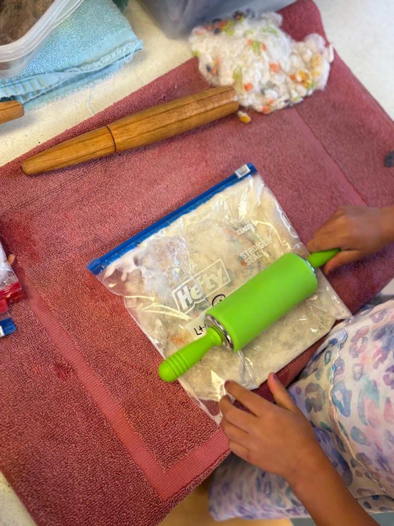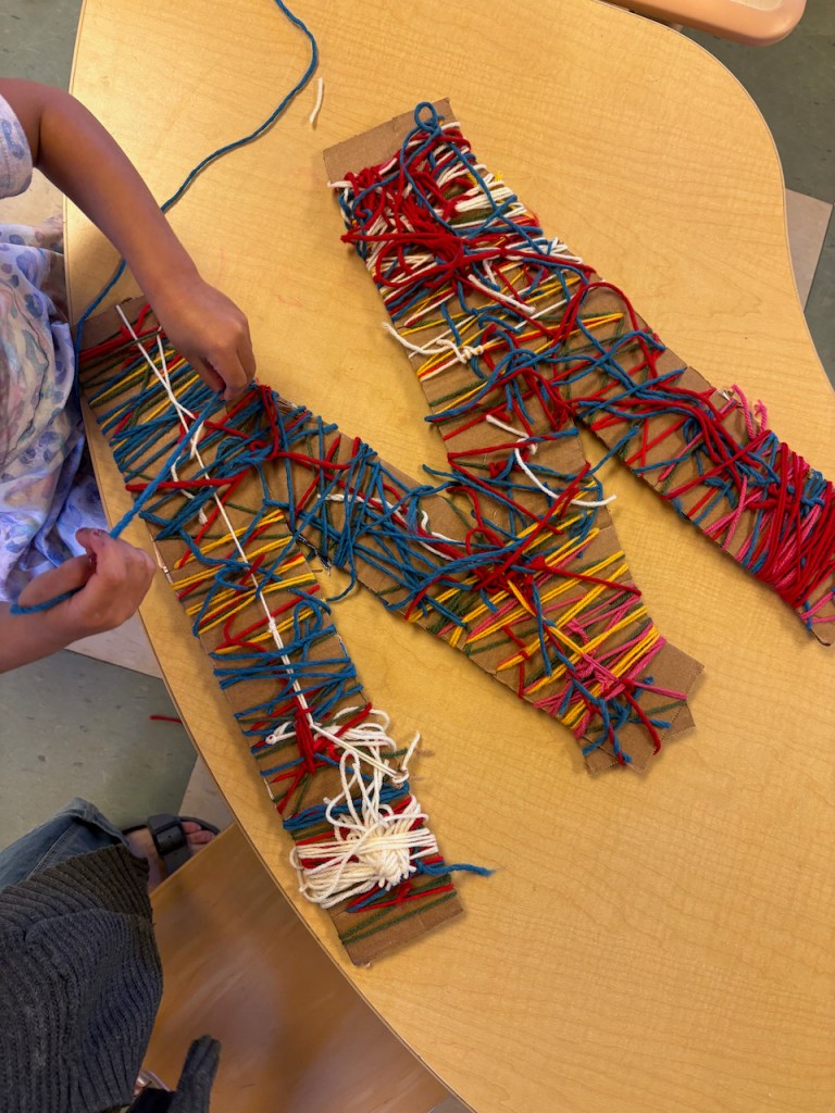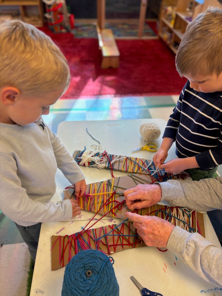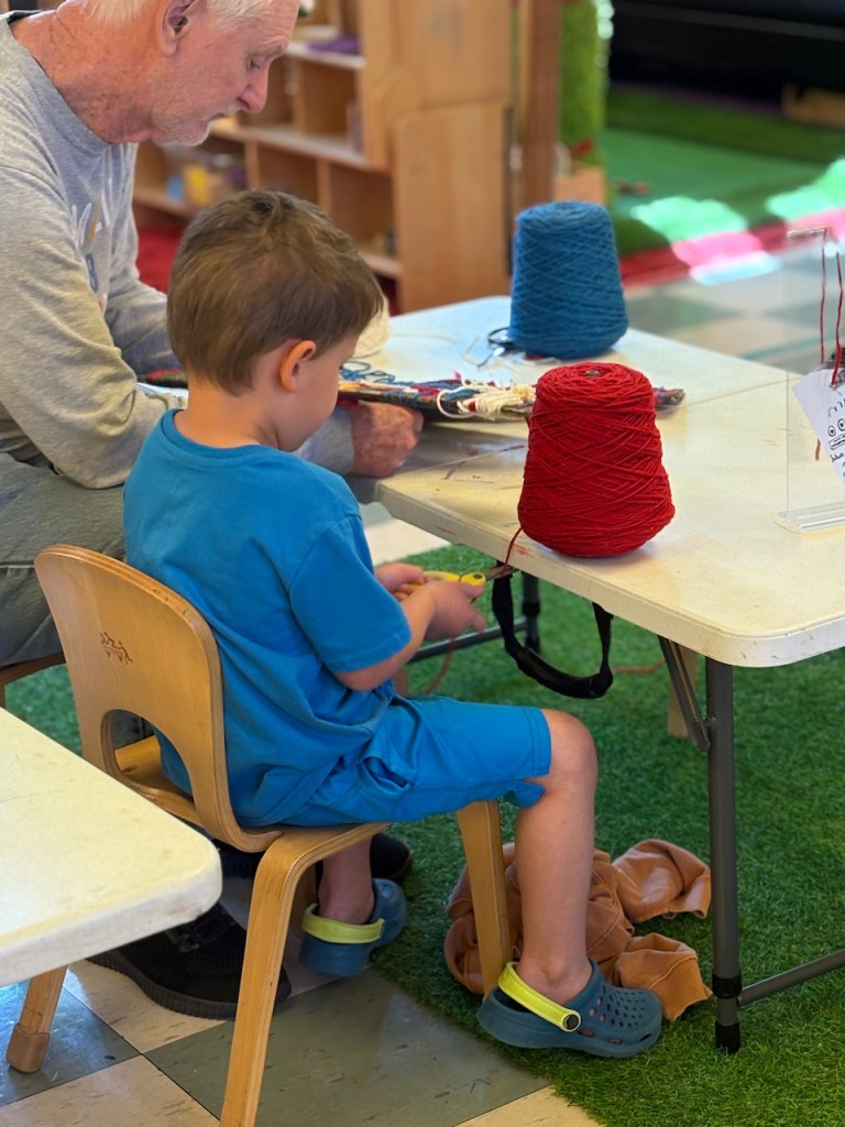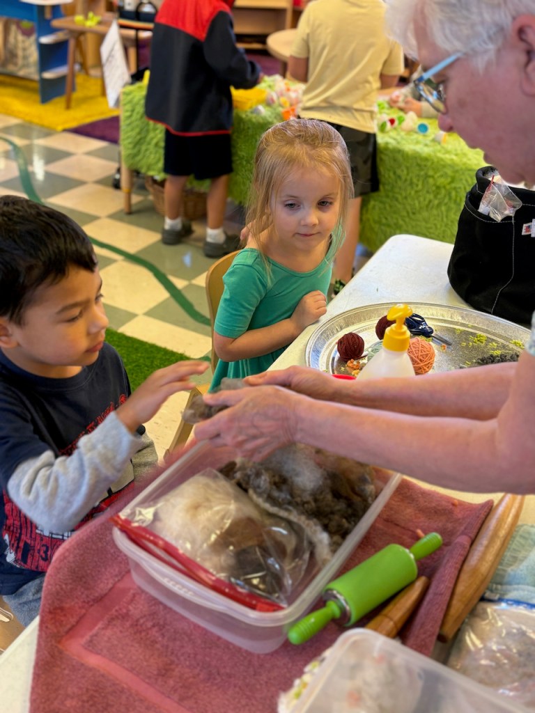 WOOL WORK: Grandma Bonnie will be helping us all week with wool work. Today we started making our Alphabet Friend, Wooly, all soft and fluffy with real wool! Some of the yarn wool has been dyed red, blue and green.