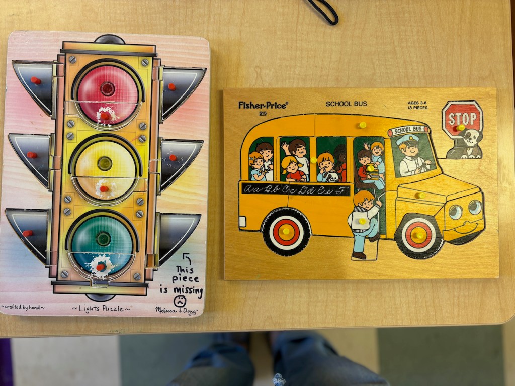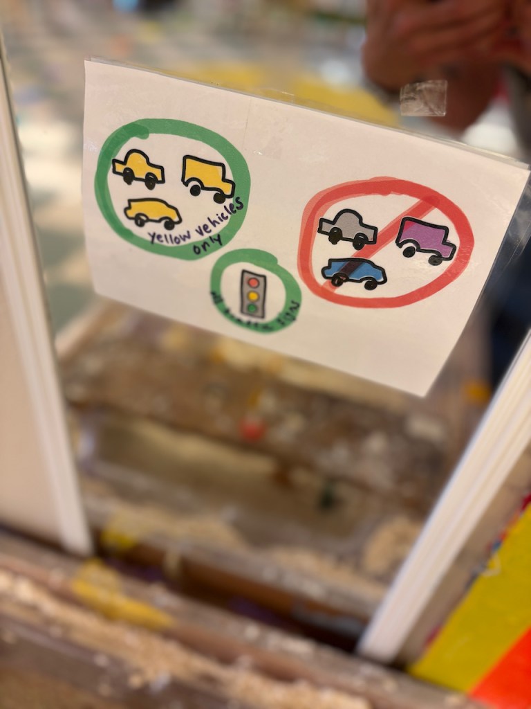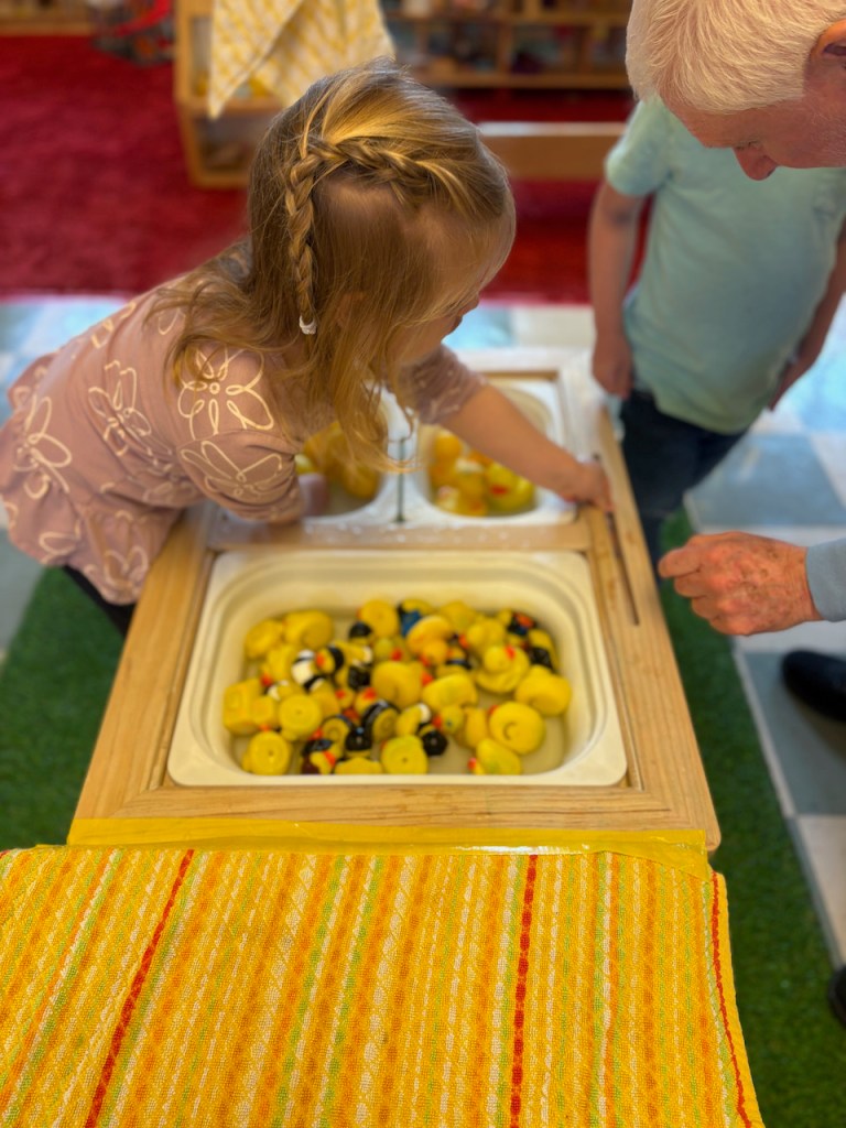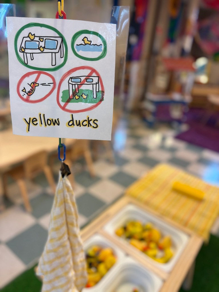 We have yellow ducks in the Water Table and yellow vehicles with traffic signs in the Tub Table. There are yellow traffic puzzles, a pretend traffic light and a yellow flower balancing game.