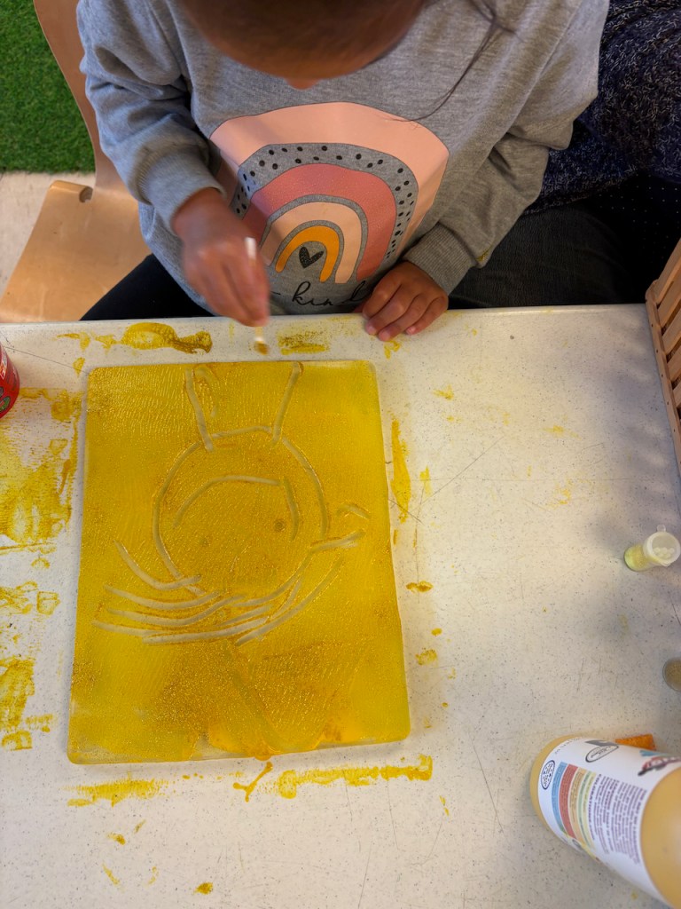 YELLOW THINGS: For our project we used yellow paint and glitter on the gel plates which has become a favorite art activity: first children rolled the yellow paint and glitter, then drew designs in it and then made yellow prints.