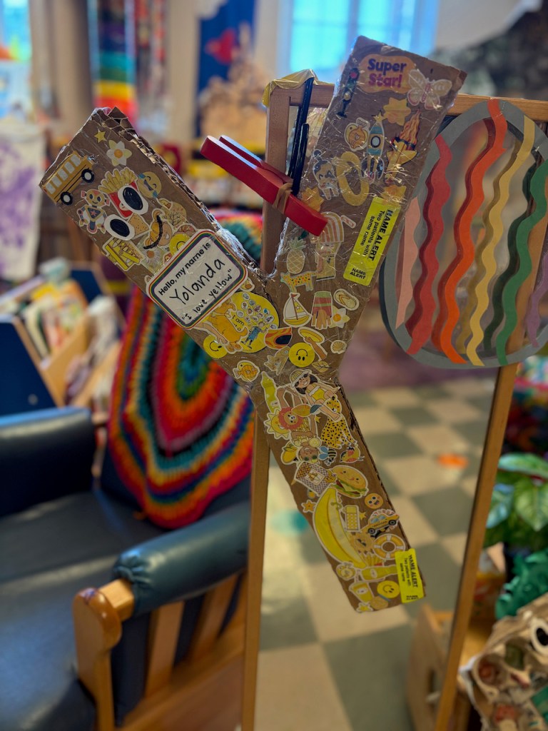 We got our Alphabet Friend, Yolanda, covered in yellow stickers. She’ll play games with us the rest of the week.