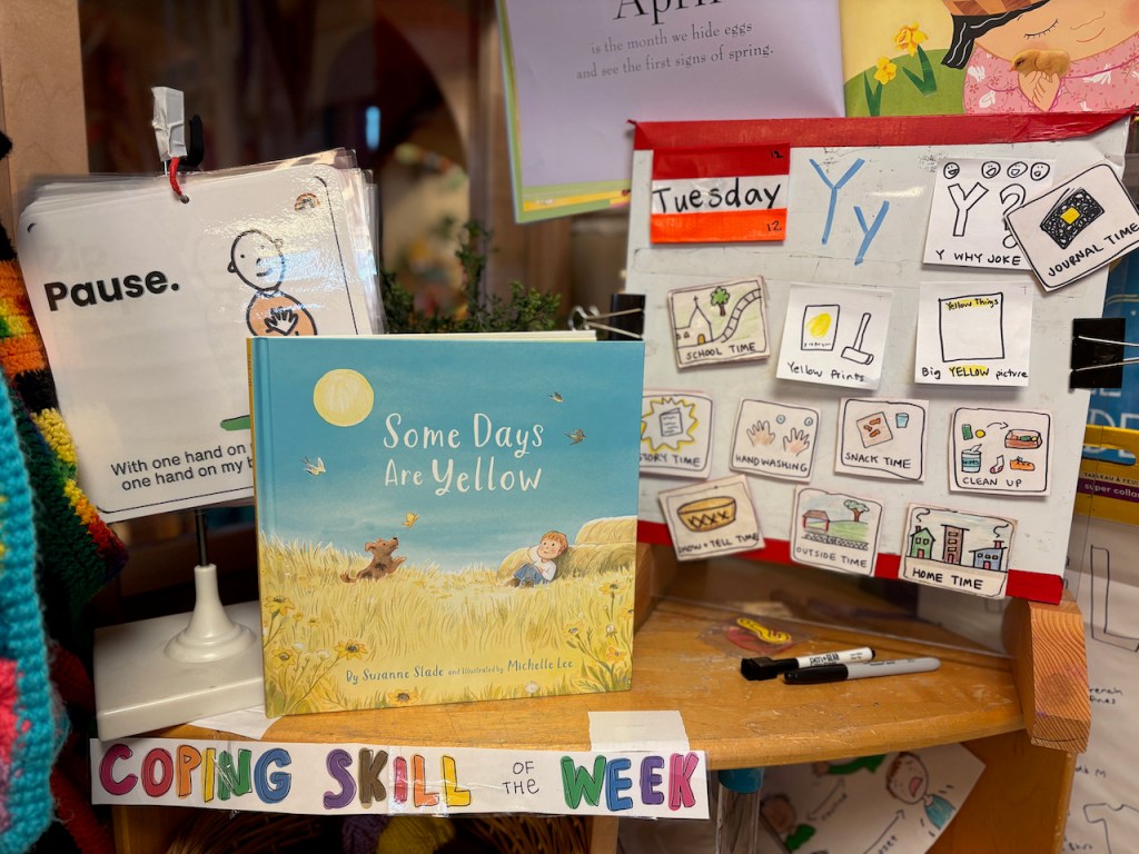 COPING SKILL OF THE WEEK: Pause. Just like the yellow of a traffic light, we can slow down and pause. Even young children can sense a safety and connection to self by resting with a hand on their belly and a hand on their heart. We practiced today and they were quiet for a long time!