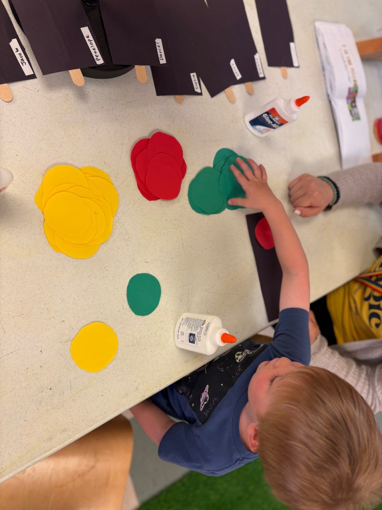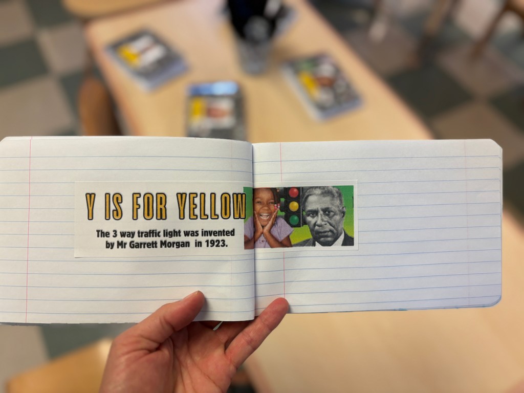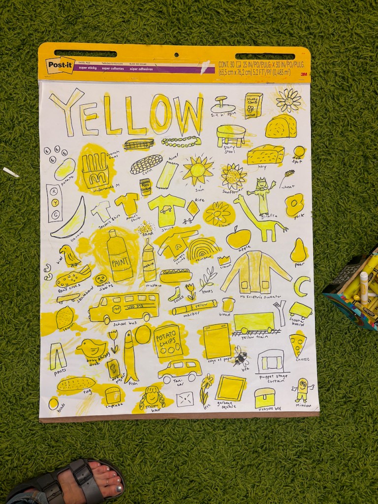 YELLOW LIGHT: We learned about Garrett Morgan who invented the yellow traffic light a hundred years ago! For our project we made traffic lights and got a picture of Mr Morgan in our journals. At Circle Time we added a yellow traffic light to the Big Yellow Picture e of all the yellow things we could think of. Our Alphabet Friend, Yolanda, is all yellow and we added her to the Big Yellow Picture too. At Snack Time we ate yellow things … but we didn’t eat a traffic light!