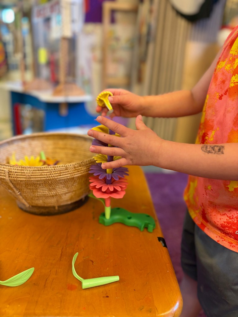 MAY DAY: In honor of May Day, we made straw flowers that all had a yellow center. Maybe you’ll be the recipient of a May Day surprise! Since it’s the first day of May, all of the purple things turned blue: the play dough, play dough tools and all the Tiny Things too! We used our old purple play dough as holders for our May Day flowers.