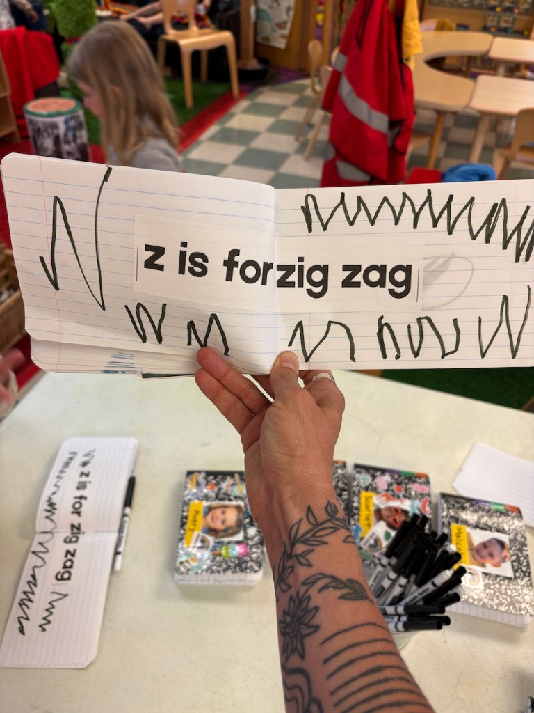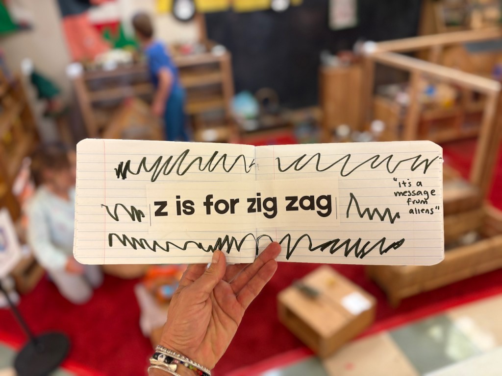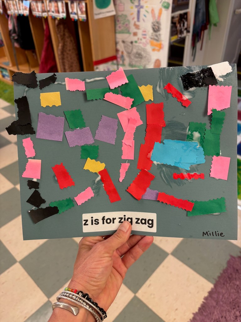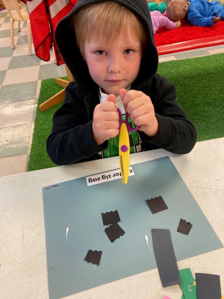 ZIG ZAG THINGS: For our project this week we’ll work on cutting along zig zag lines and using new zig zag scissors…this is a very tricky task! We also have a journal prompt inviting us to draw zig zag lines.