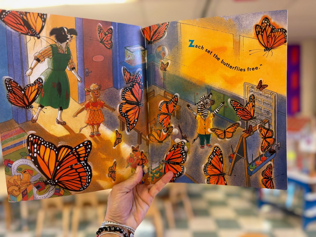 STORY TIME: We followed some characters through four Miss Bindergarten books all by Joseph Slate: where she gets ready for Kindergarten, where they have a wild day in Kindergarten, where she stays home sick from Kindergarten and the last day of Kindergarten. The Z friend, Zach the Zebra was the one who got to let the butterflies free!