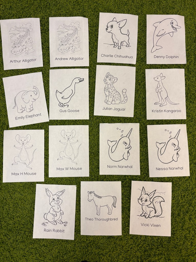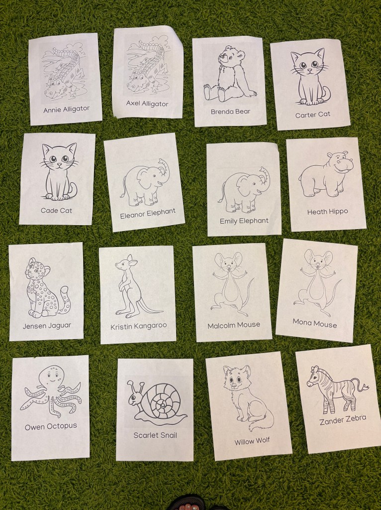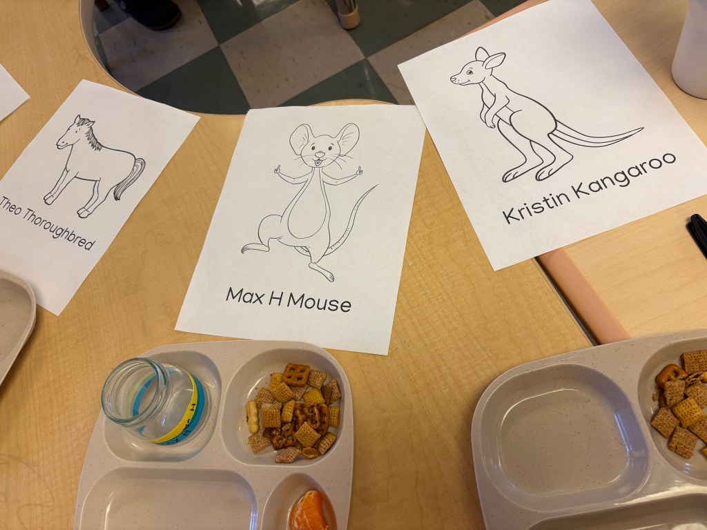ANIMAL NAMES: Just like the characters in Miss Bindergarten books, we gave our name to an animal! The first sound of our name has to match the first sound in the animal name, just like the book. We went in alphabetical order backwards so our Golden Letter friend, Zander, got to get his paper first….and he matched Zach Zebra in our book!