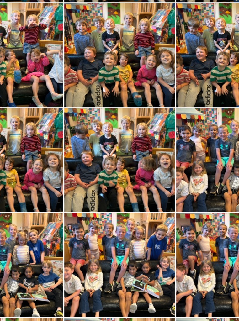 Next Thursday is our last Thursday of the school year! So today we took a class picture on the black couch (calling it “Black Couch Time” on the Schedule Board). Children will get their own copy next week. Here’s a sneak peek at the sessions: