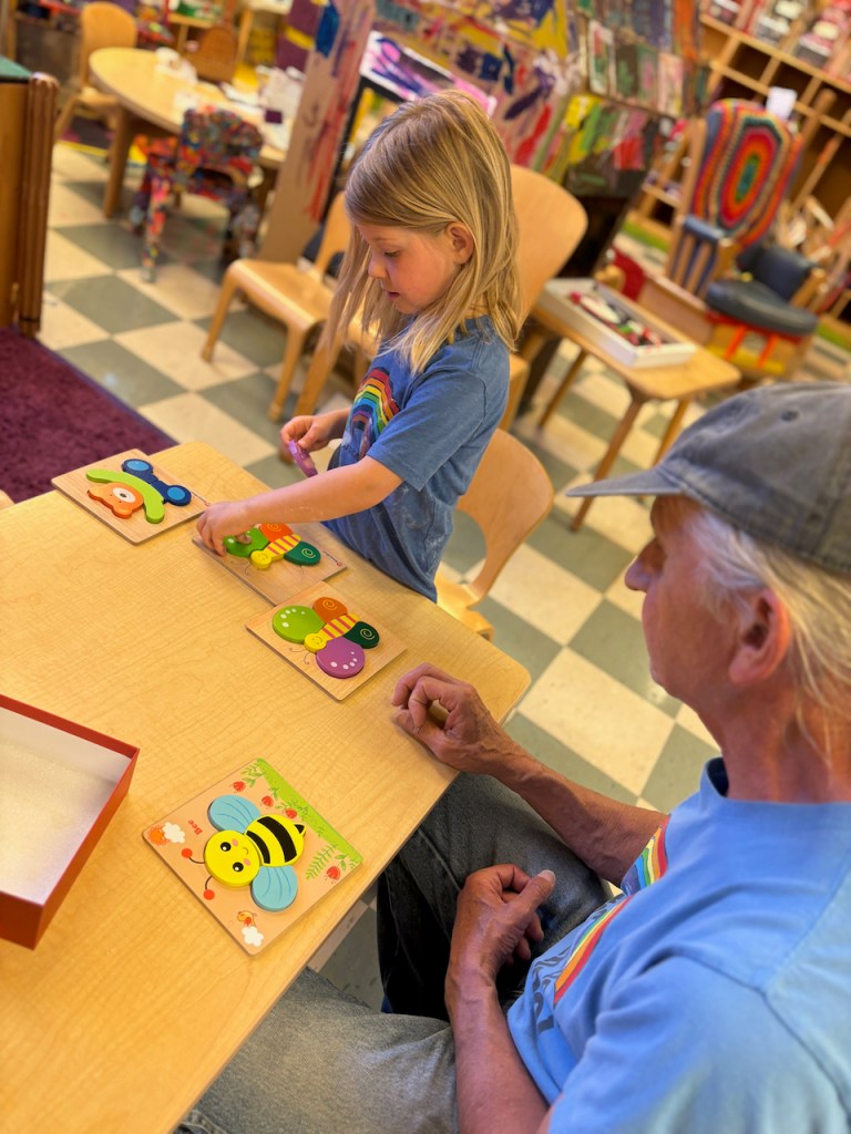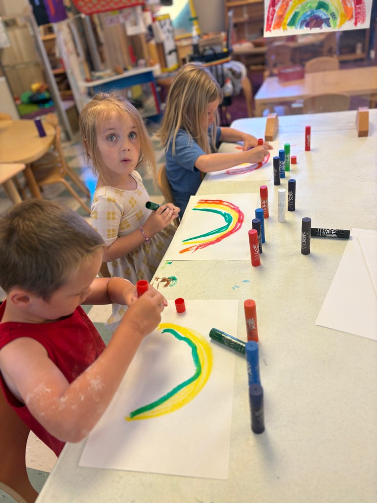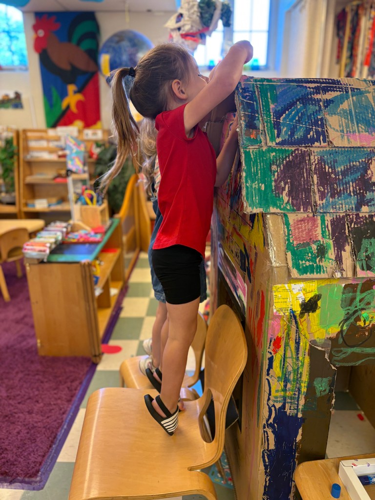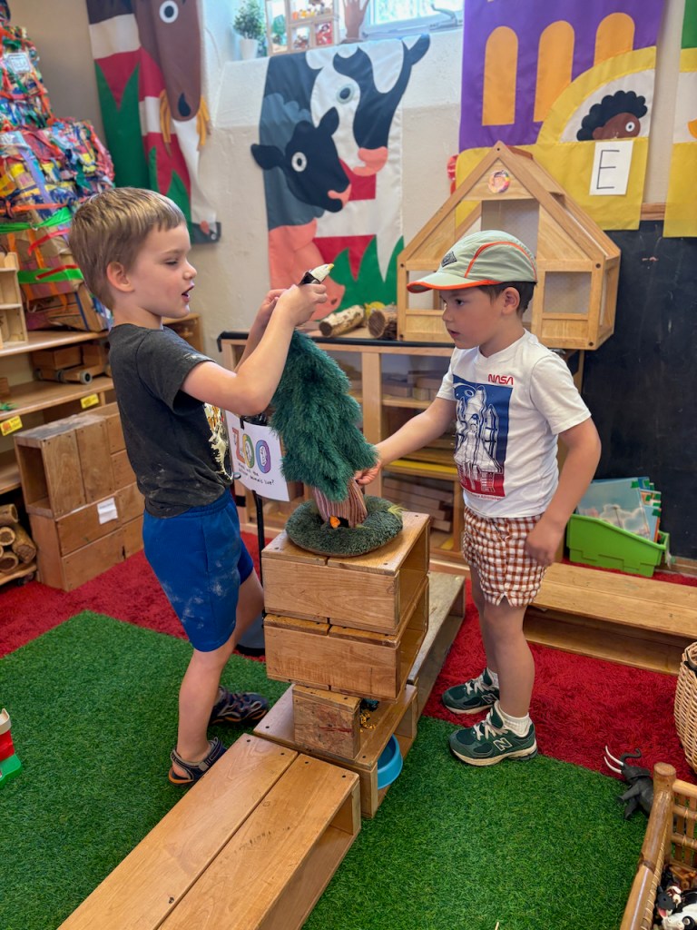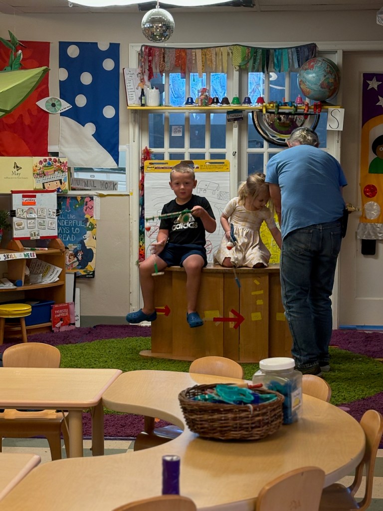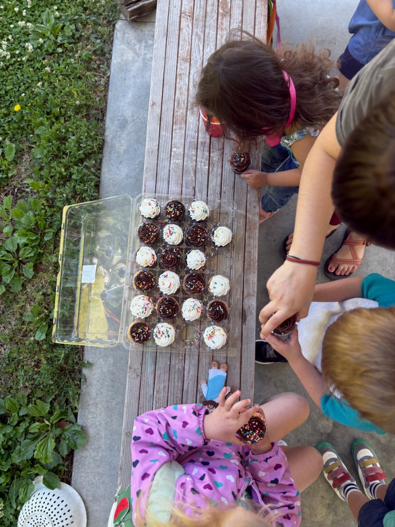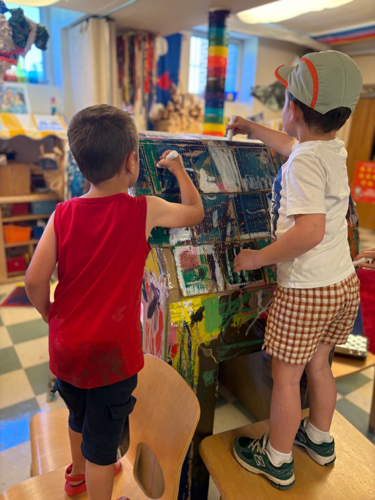 On this very last day of the 2024-2025 school year we used up the paint sticks on our own paintings and on the cardboard house, we played with new puzzles and fishing poles, we pushed each other on the swing. In the morning class we had summer birthday cupcakes and in the afternoon we had a popcorn popsicle party. The mulberries are still ripe for picking and eating, the plastic frogs are in the warm soapy water outside. We cleaned the room so much it looked like preschool hadn’t happened today. Thank you, dear families for allowing us to spend time with your children…we have seen tremendous growth in each child and it is so rewarding. Click on the photos below to see full size and also to download as you like: