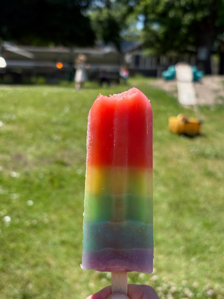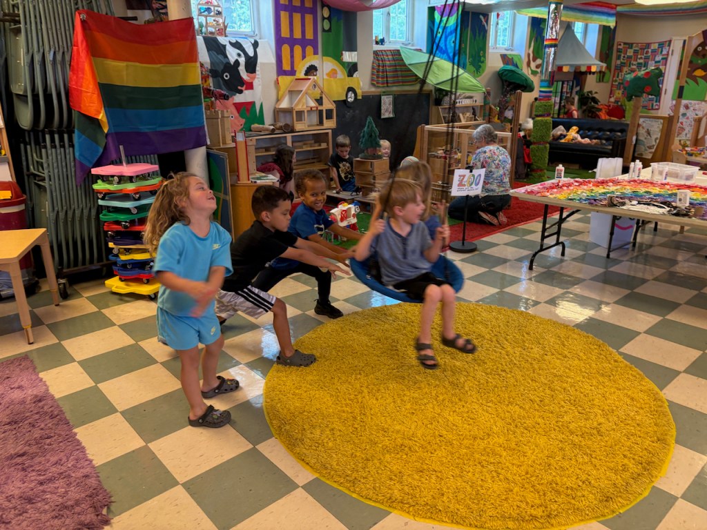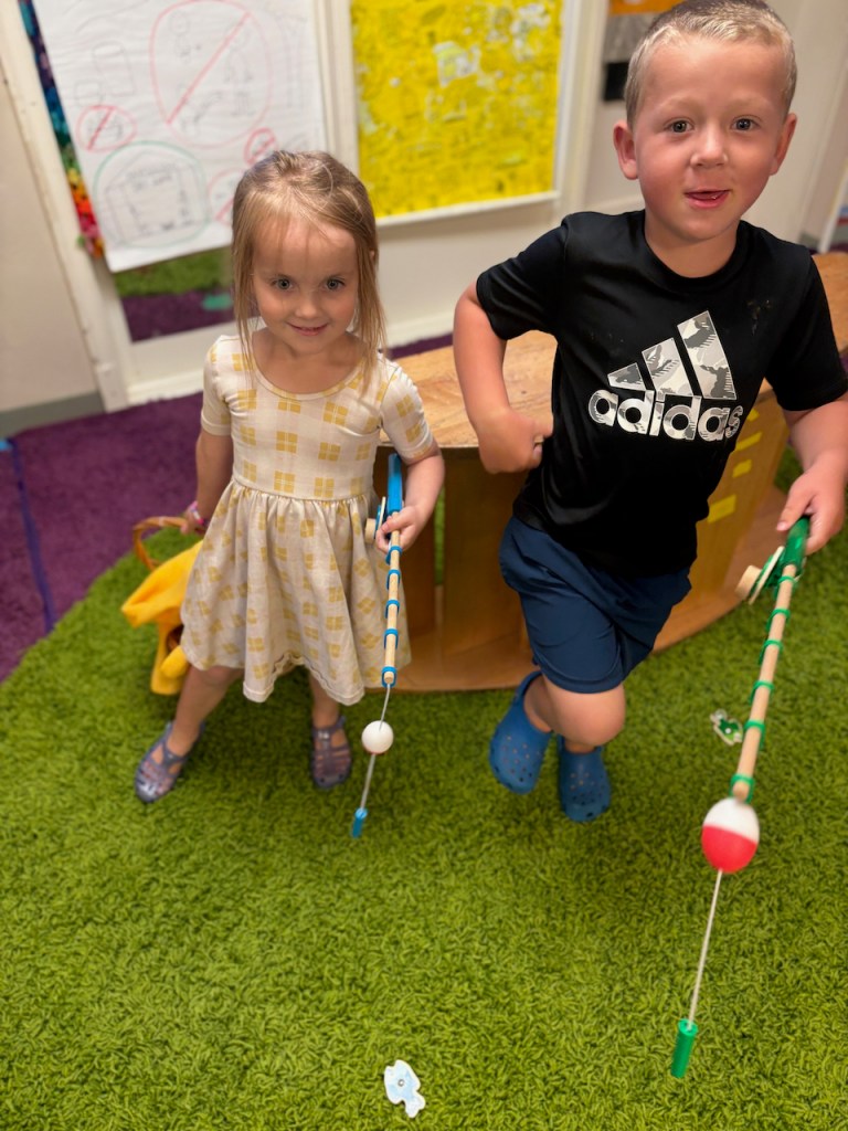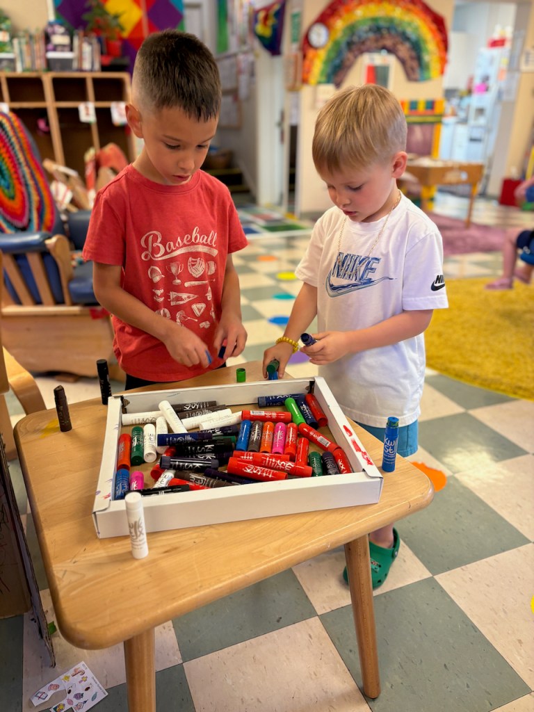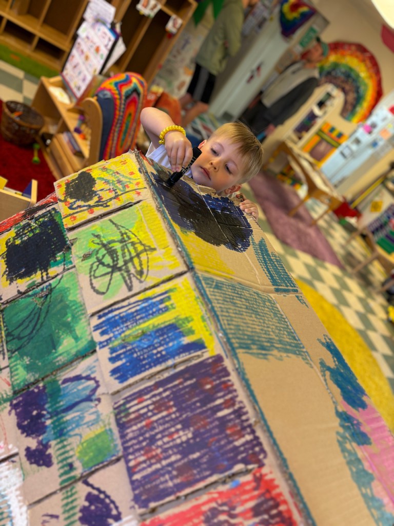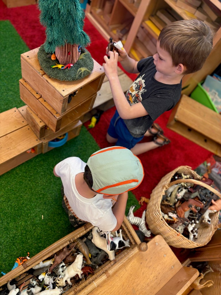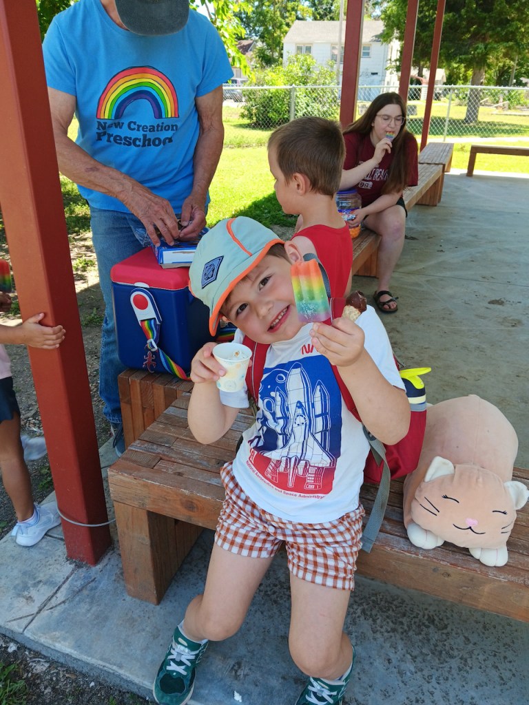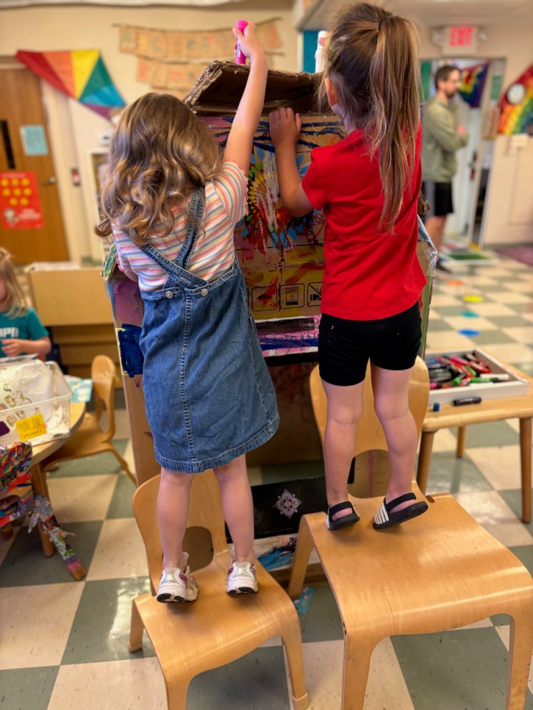 On this very last day of the 2024-2025 school year we used up the paint sticks on our own paintings and on the cardboard house, we played with new puzzles and fishing poles, we pushed each other on the swing. In the morning class we had summer birthday cupcakes and in the afternoon we had a popcorn popsicle party. The mulberries are still ripe for picking and eating, the plastic frogs are in the warm soapy water outside. We cleaned the room so much it looked like preschool hadn’t happened today. Thank you, dear families for allowing us to spend time with your children…we have seen tremendous growth in each child and it is so rewarding. Click on the photos below to see full size and also to download as you like: