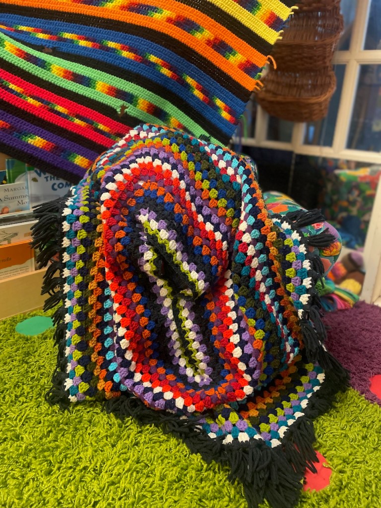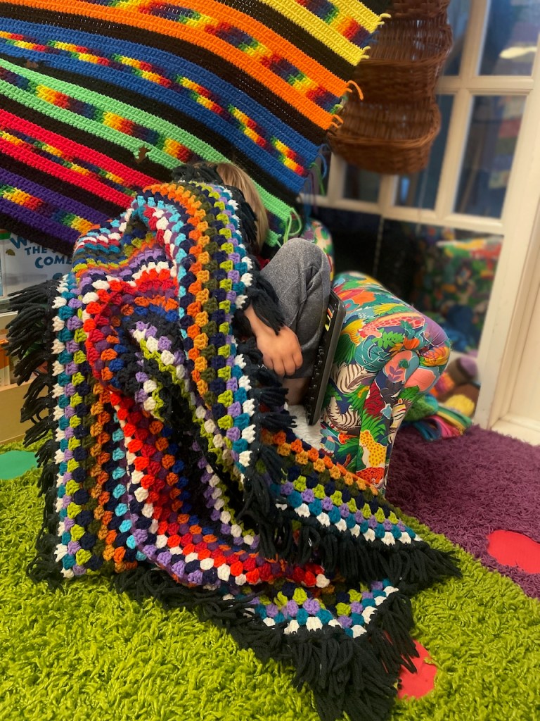 What do you do if you don’t want to sit at Circle Time? They can lay down, stand, get a pillow, etc. What is most important in this skill set is noticing what their body wants to do and honoring it. If a child is uncomfortable for any reason sitting “criss cross applesauce,” I want them to move and adjust. We have several cozy corners children can retreat to anytime….one friend brought a photo of his mom and dad with him: