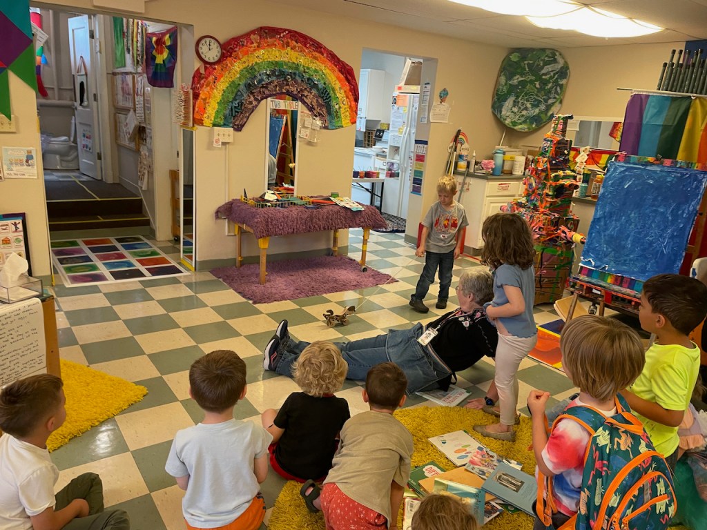 What do you do if you’re cold at preschool? Children can put outerwear on or use one of our many blankets (there are a variety of textures and sizes). In cold weather months they can stand under an HVAC vent to feel the warm air. Cuddling with another person or rubbing their own arms/legs can also meet the need. Circle Time is under one of our vents and one child cared for his being cold by getting very cozy under pillows and blankets: