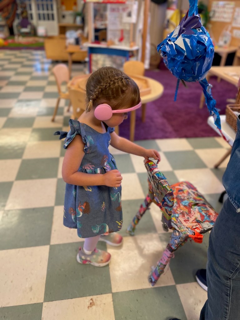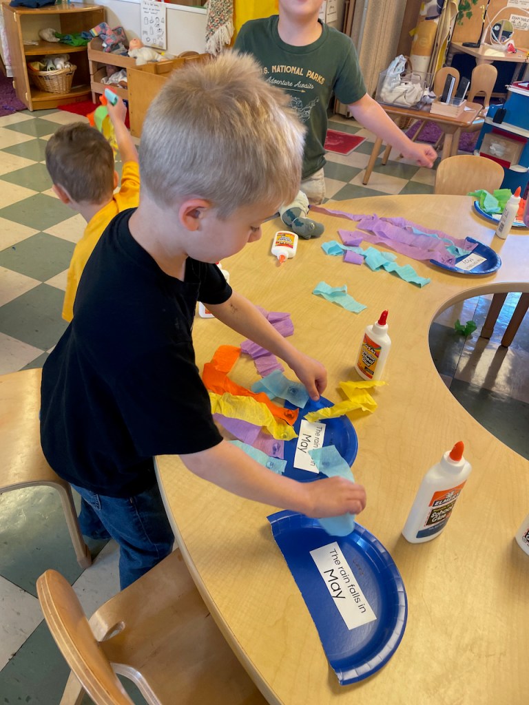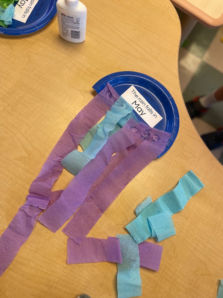 Ms Kristin had the paper strips in buckets hanging from the ceiling. They could get the colors they wanted in any way they wanted: crawling under, having a friend swing them the bucket, climbing on the table, using a scooter to get under, etc. Bonus: inevitably they looked up to see how the buckets were suspended.