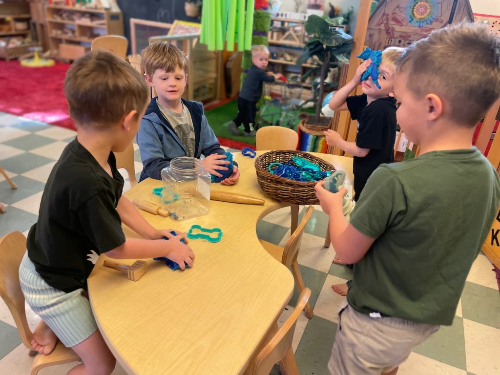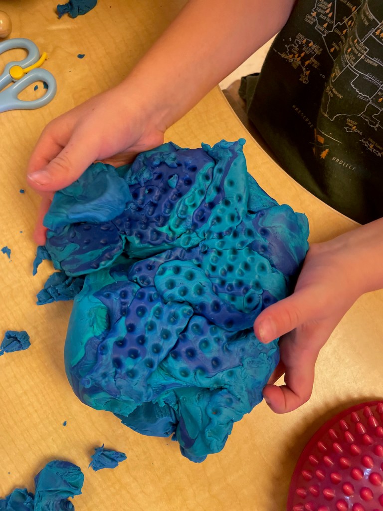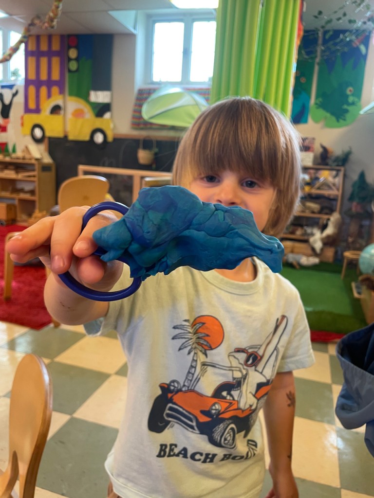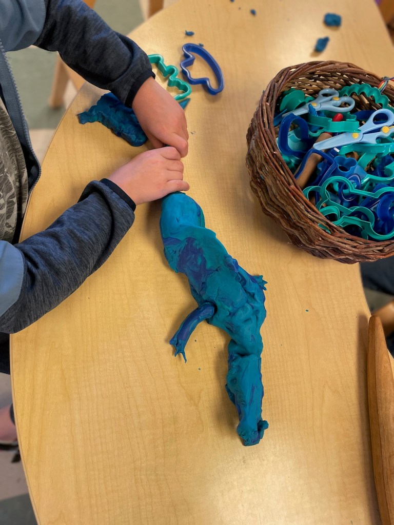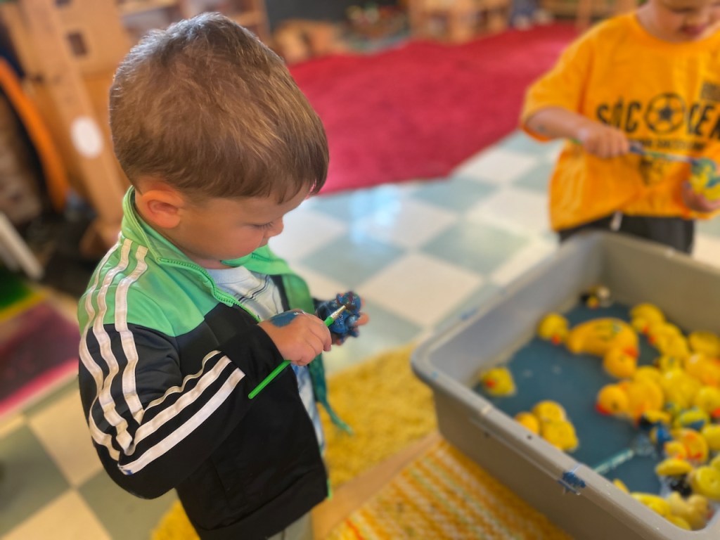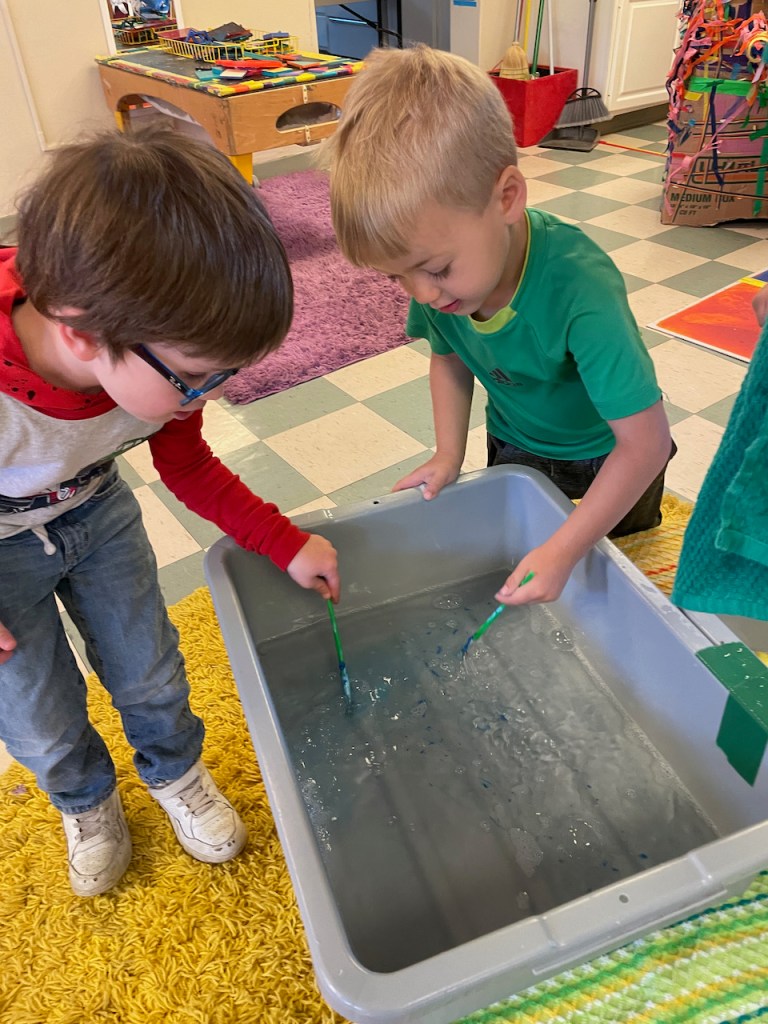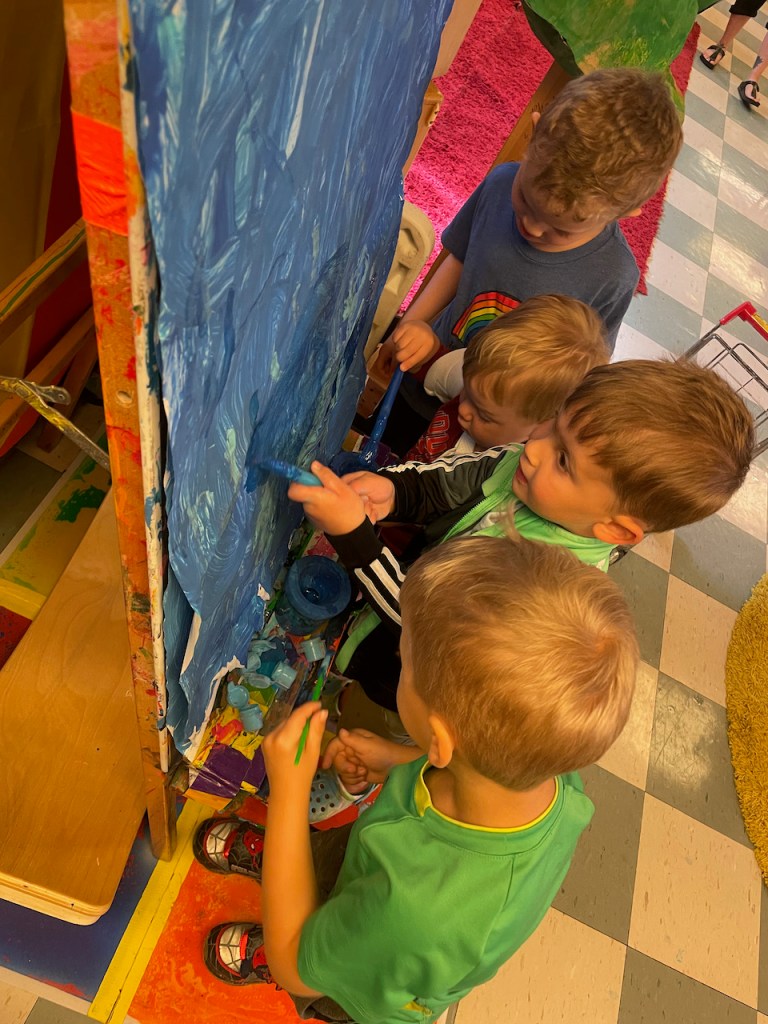 By washing the blue paint off our hands and the yellow ducks! The easel has different shades of blue and duck painting is allowed.