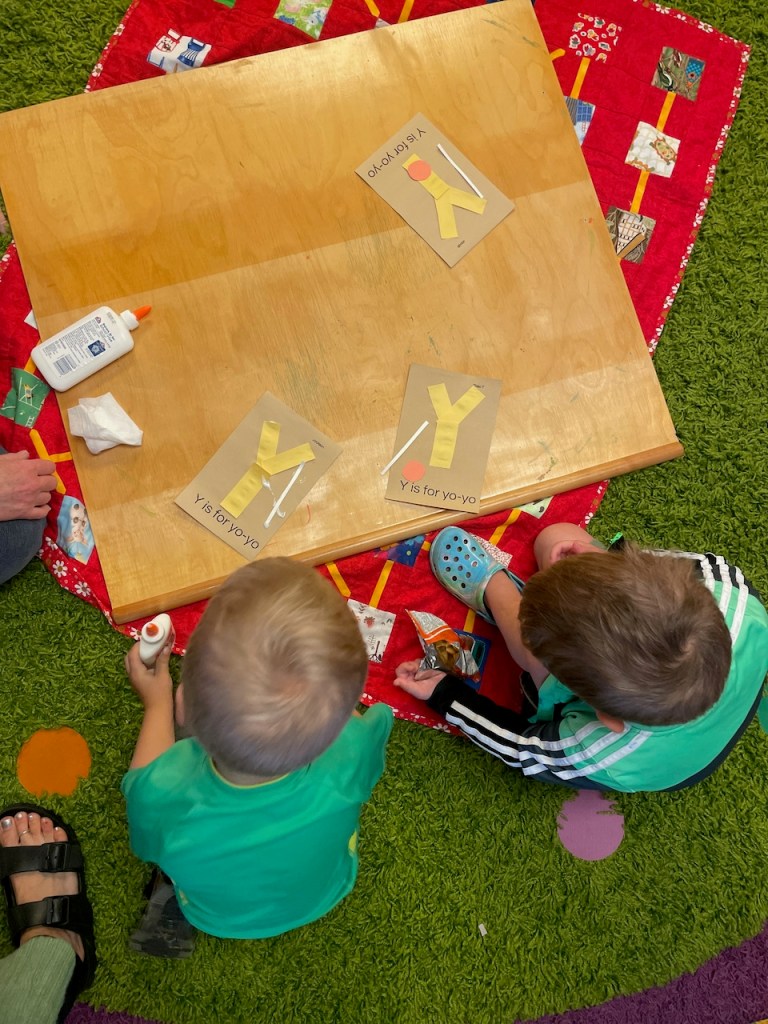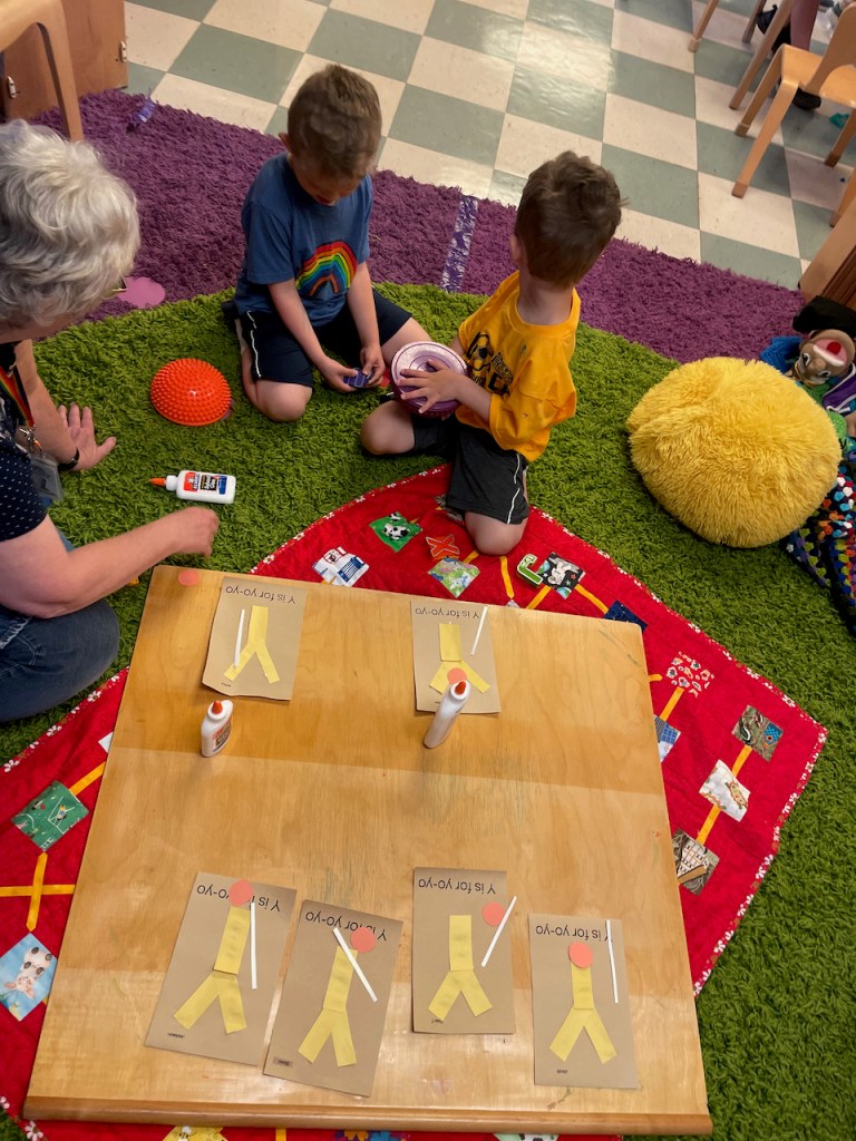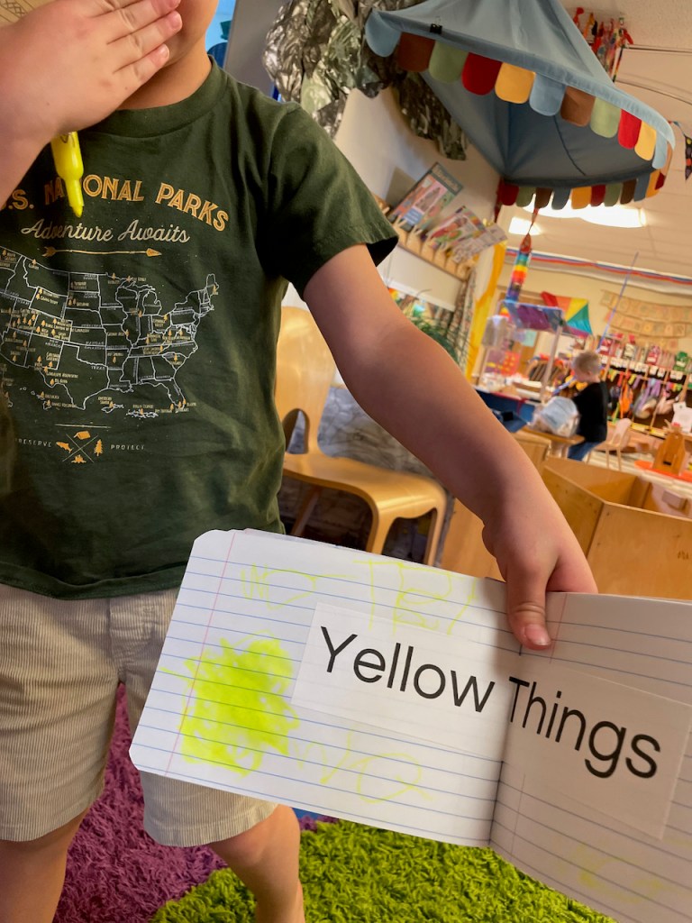 Since “yellow” starts with the letter Y, we looked at objects of different shades of yellow and then drew yellow things with bright highlighter markers. We also played I Spy and told stories about the yellow things on our Story Quilt from Grandma Bonnie.