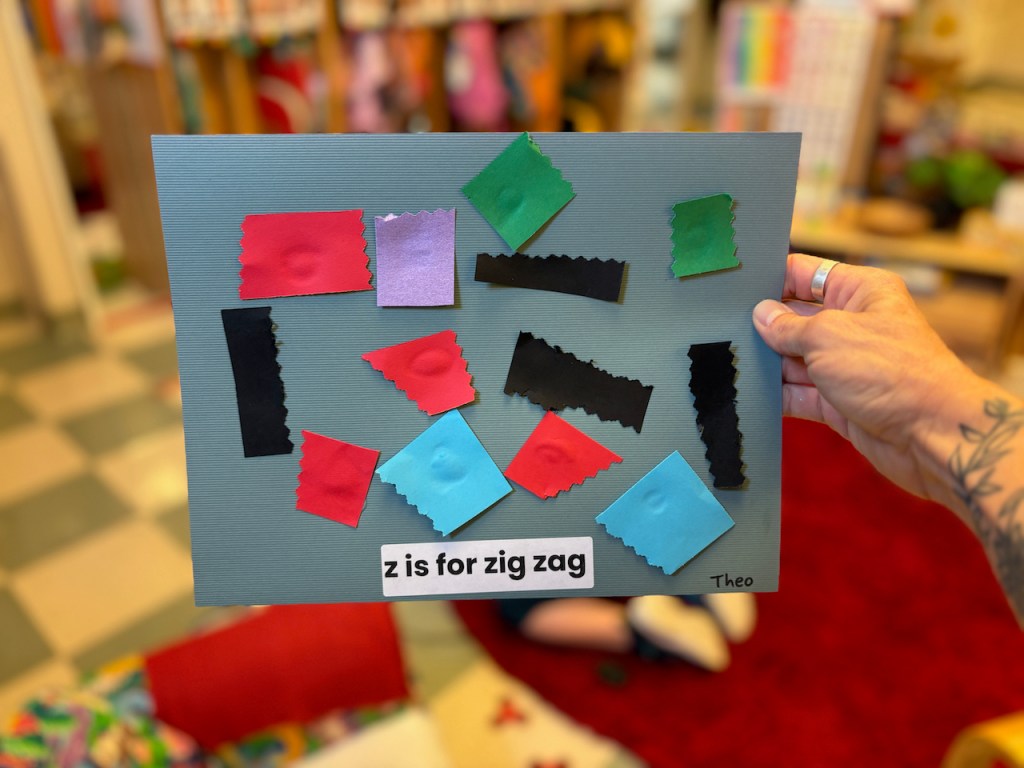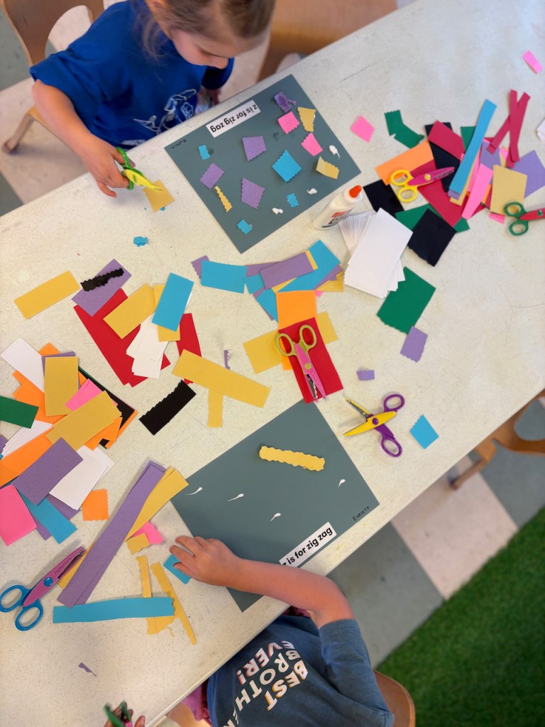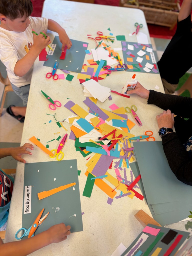 ZIG ZAG THINGS: For our project this week we’ll work on cutting along zig zag lines and using new zig zag scissors. We also have a journal prompt inviting us to draw zig zag lines.