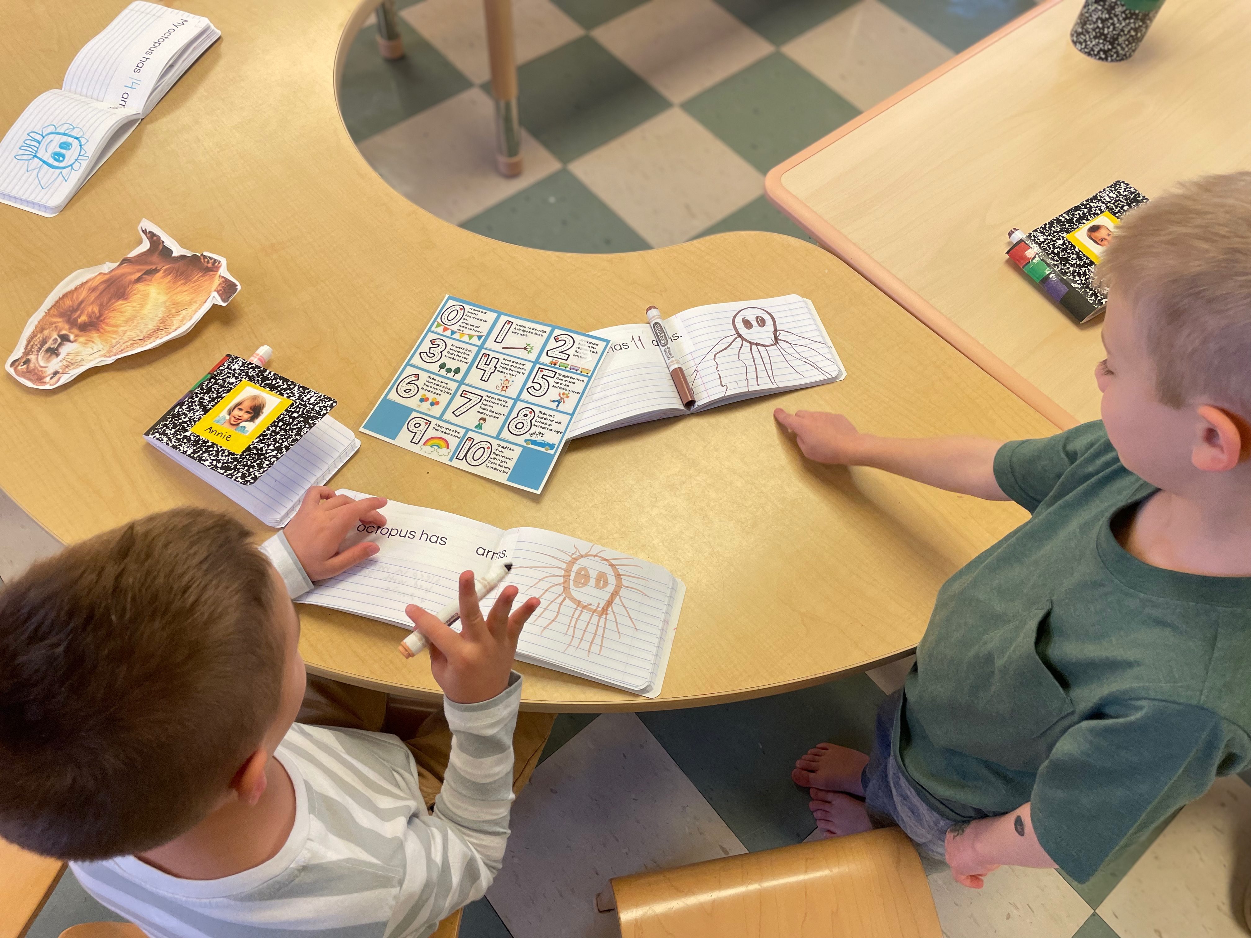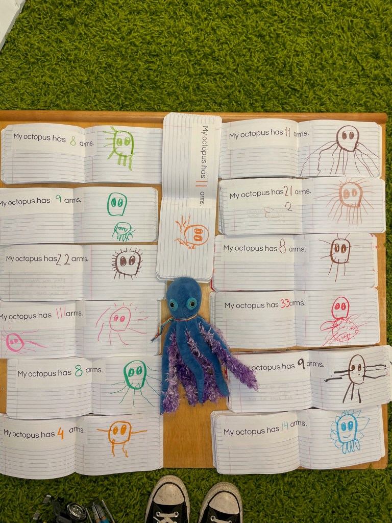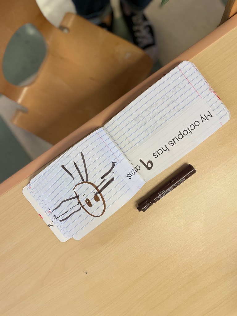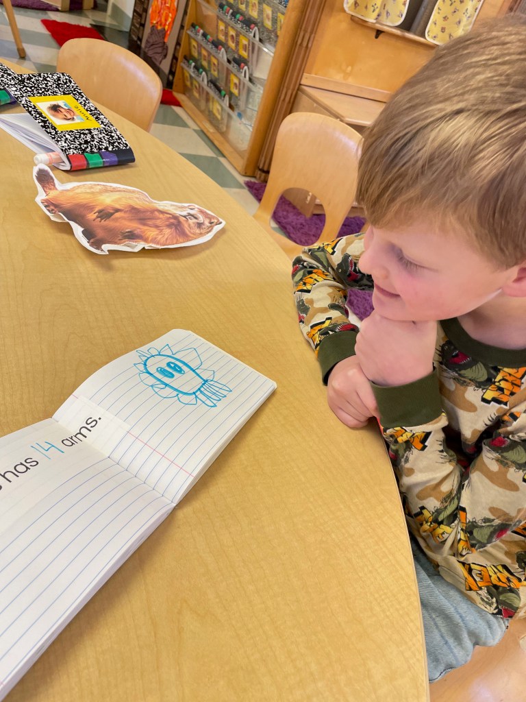 We also finished alphabet projects by gluing on octopus limbs and drew in our journals today, making as many limbs on the octopus as we wanted…sometimes there were very clever stories about them.
