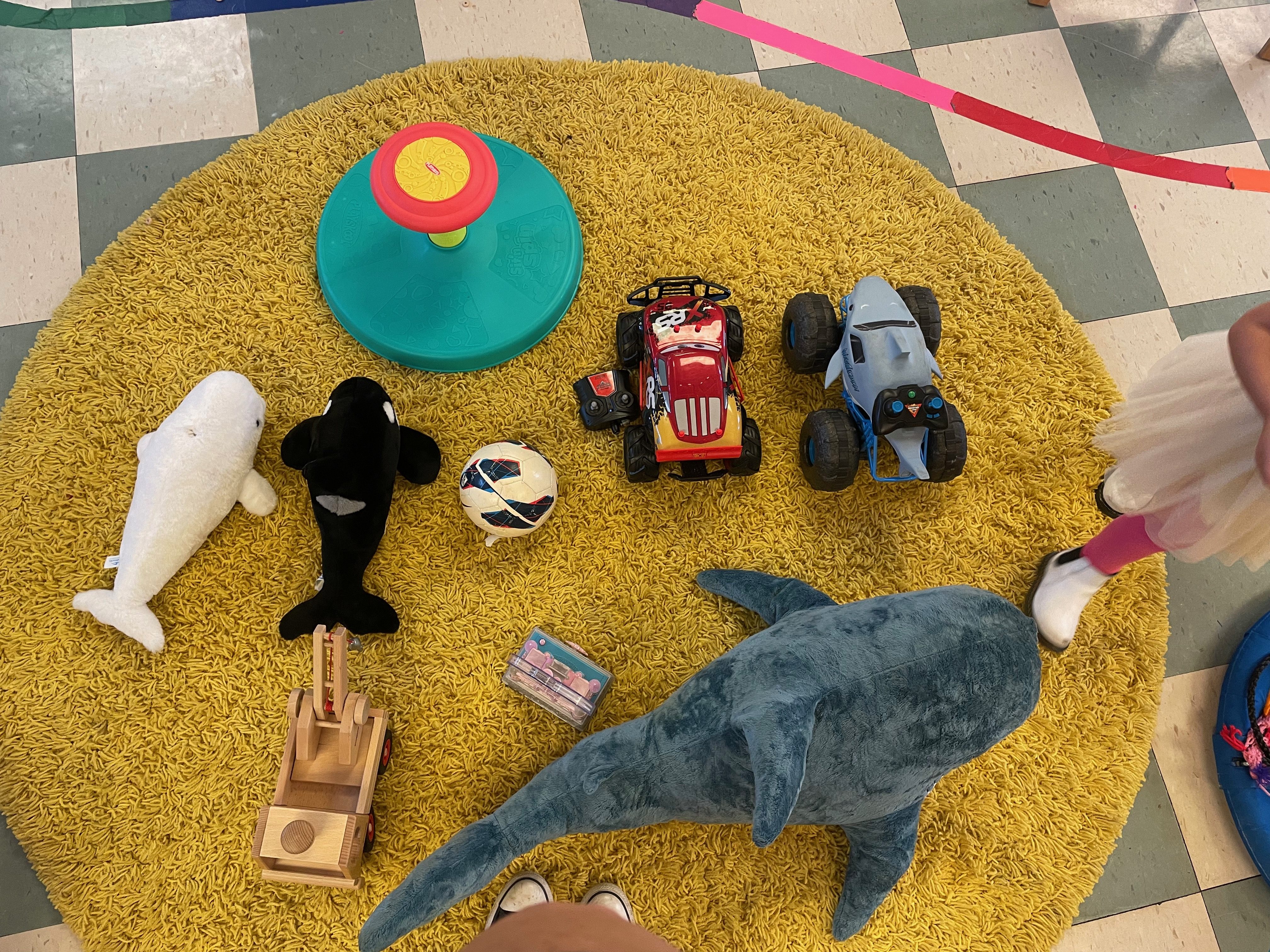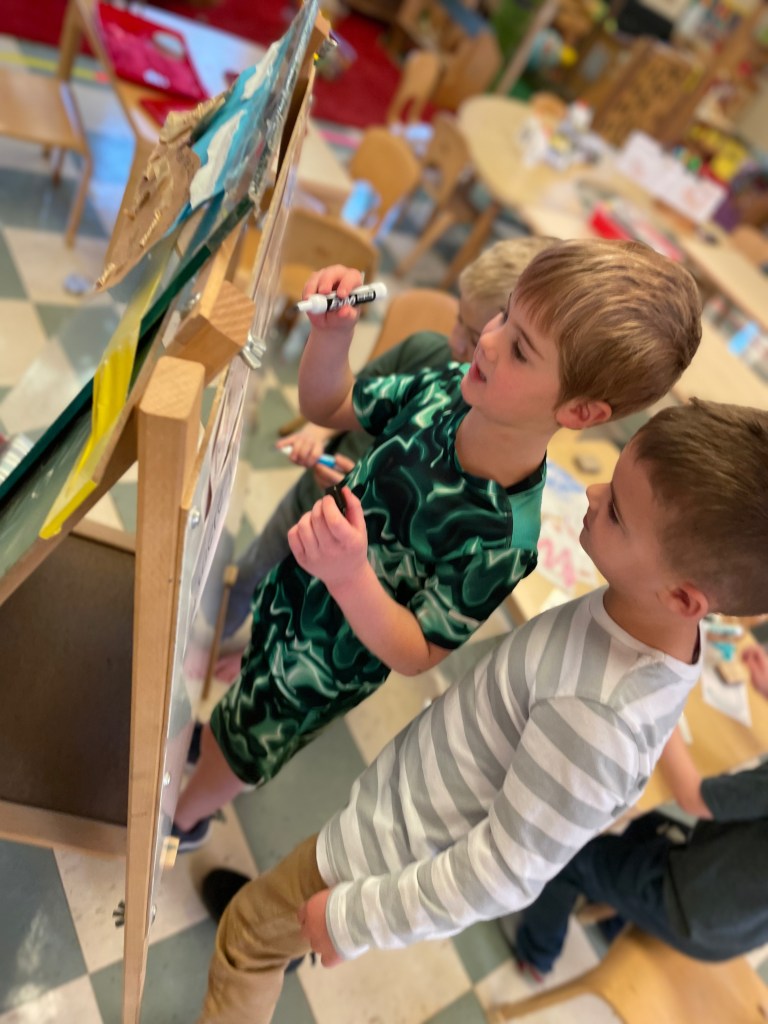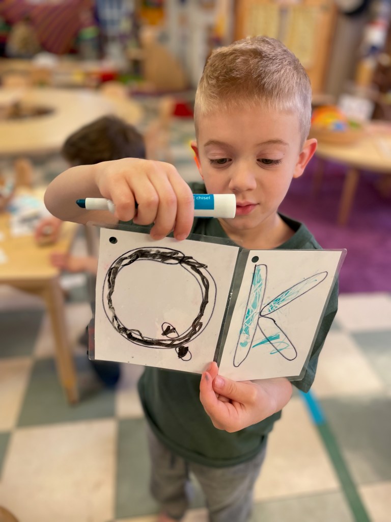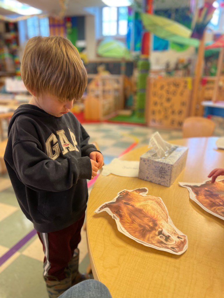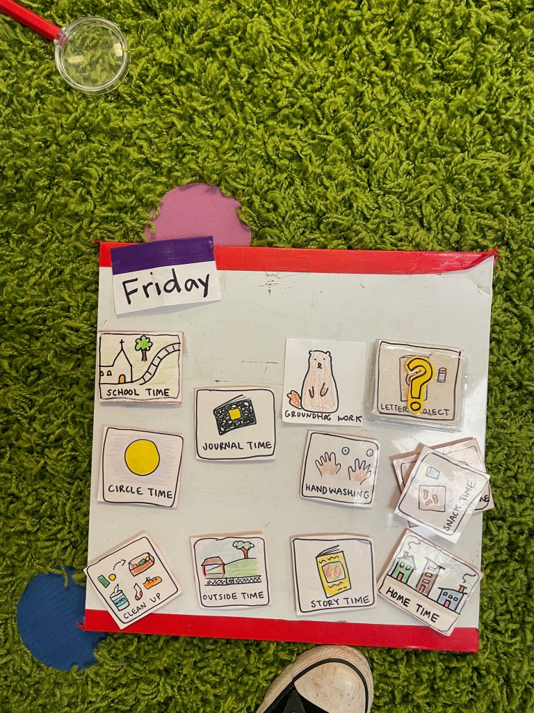 We had a sneaky thing on the schedule board today: Show and Tell was hiding under the Snack Card! That’s because we did telling during Snack Time and the showing during Outside Time.