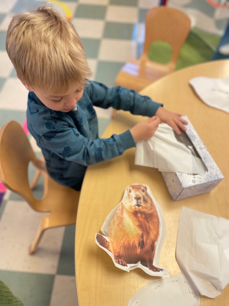 But we also celebrated Groundhog Day and learned some facts about groundhogs in general and Punxsutawney Phil from Pennsylvania. We made paper pillow groundhogs by stuffing them and stapling them shut. Then they got to go hide in their burrow.